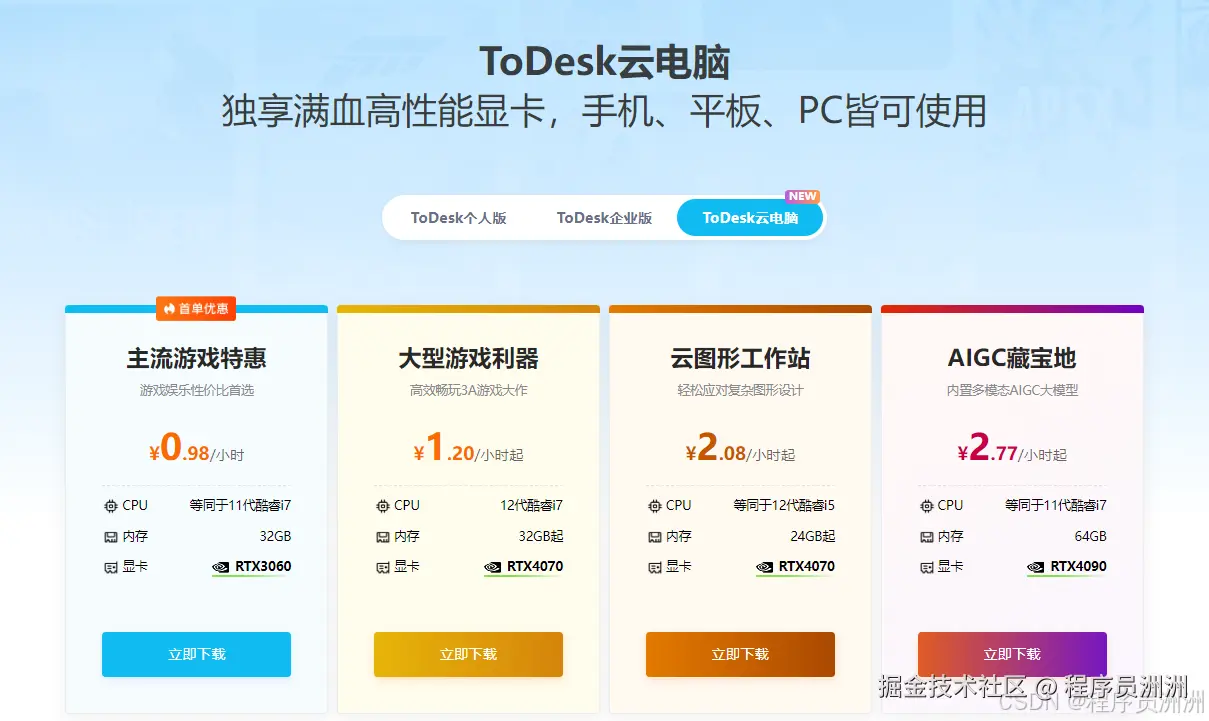 ToDesk云电脑是一款支持多场景的云端服务,提供高性能配置的云电脑,分布有云设计渲染、云游戏、云AIGC等功能。用户可以通过手机、电脑、网页等多种方式轻松上云,享受超高清画质,低延时,安全稳定的云体验。从软件配置列表里可以看出,ToDesk云电脑这边提供的配置有3060/4070电竞,4070云图形工作站,4070AIGC等配置,也有云硬盘的选项,云硬盘可以在云电脑的基础上扩容。