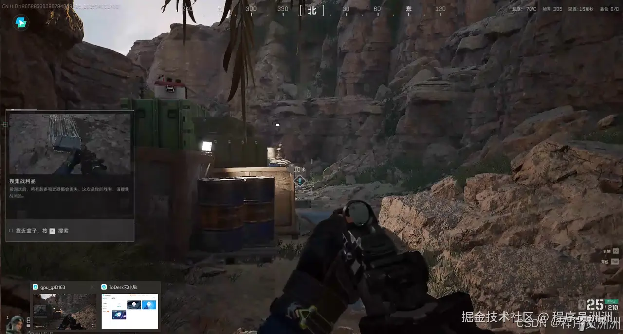 因为ToDesk在《黑神话:悟空》方面的性能和体验感都非常好,我想着继续用ToDesk云电脑尝试一下别的游戏。所以接下来继续使用ToDesk,切换身份为瓦学弟,最高支持120hz显示,可惜我的显示屏体现不出来,可以看到与云电脑和游戏服务器的延迟只有10hz,操作延迟相比英雄联盟这样的moba游戏有点明显,拉枪的时候会感觉略有卡顿,推荐在更好的网络环境下运行,但也不是不能玩,我认为如果你是下三段偶尔娱乐以下还是OK的!这波我在云电脑里打中等靶打了20个,有没有瓦学弟评价一下实力!