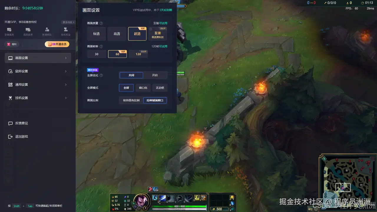 首先使用START云游戏。登录英雄联盟,进入训练模式,我们可以从菜单中试用VIP高帧率,由于我的显示屏只有60hz,所以这里试用60hz,云电脑和游戏服务器的延迟为23ms,操作延迟则没有给出具体参数。作为英雄联盟10年老玩家客观评价一下啊,只要你不是对低延迟要求很高的竞技类玩家,目前我用wifi信号的延迟也能达到一个可以游玩的水平了,比我原来的卡的不行的本地运行好了非常多!