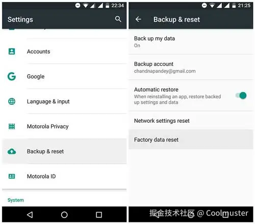 步骤 1. 打开Android设备上的“设置”,然后向下滚动以选择“备份和重置”选项。确保同一个 Google 帐户与您的设备关联。