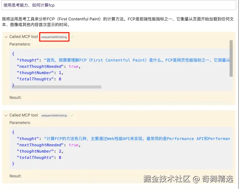 在COMPOSER对话页,开启agent模式才能调用MCP服务。如果希望调用该MCP服务,可以添加(使用思考能力)等和思考相关的提示词,即可开启。调用时,Called MCP tool 后面就会带上sequentialthinking的标志,意味着调用成功了。