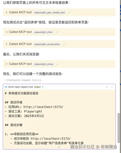 使用puppeteer/Playwright工具,测试http://localhost:5173/的表单提交。 在自动执行了一些脚本之后,就会调用MCP服务: