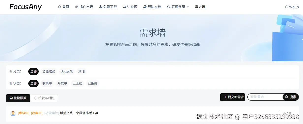 需求墙是一个用于收集 FocusAny 需求的功能应用,在这里可以提出您的产品建议和产品需求,您的想法将影响产品走向!