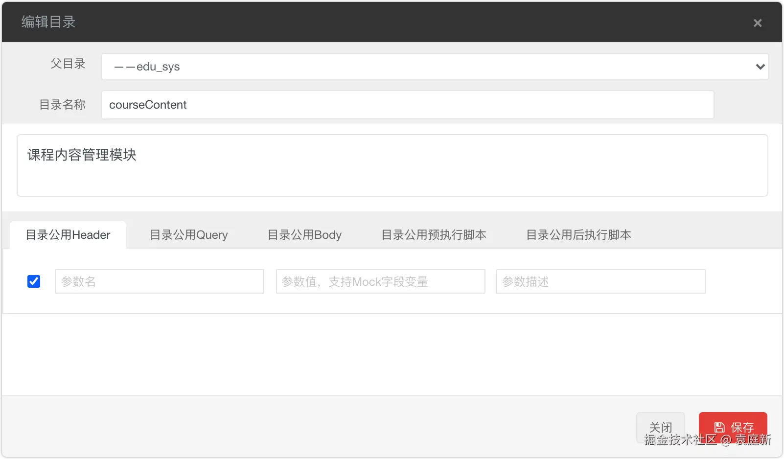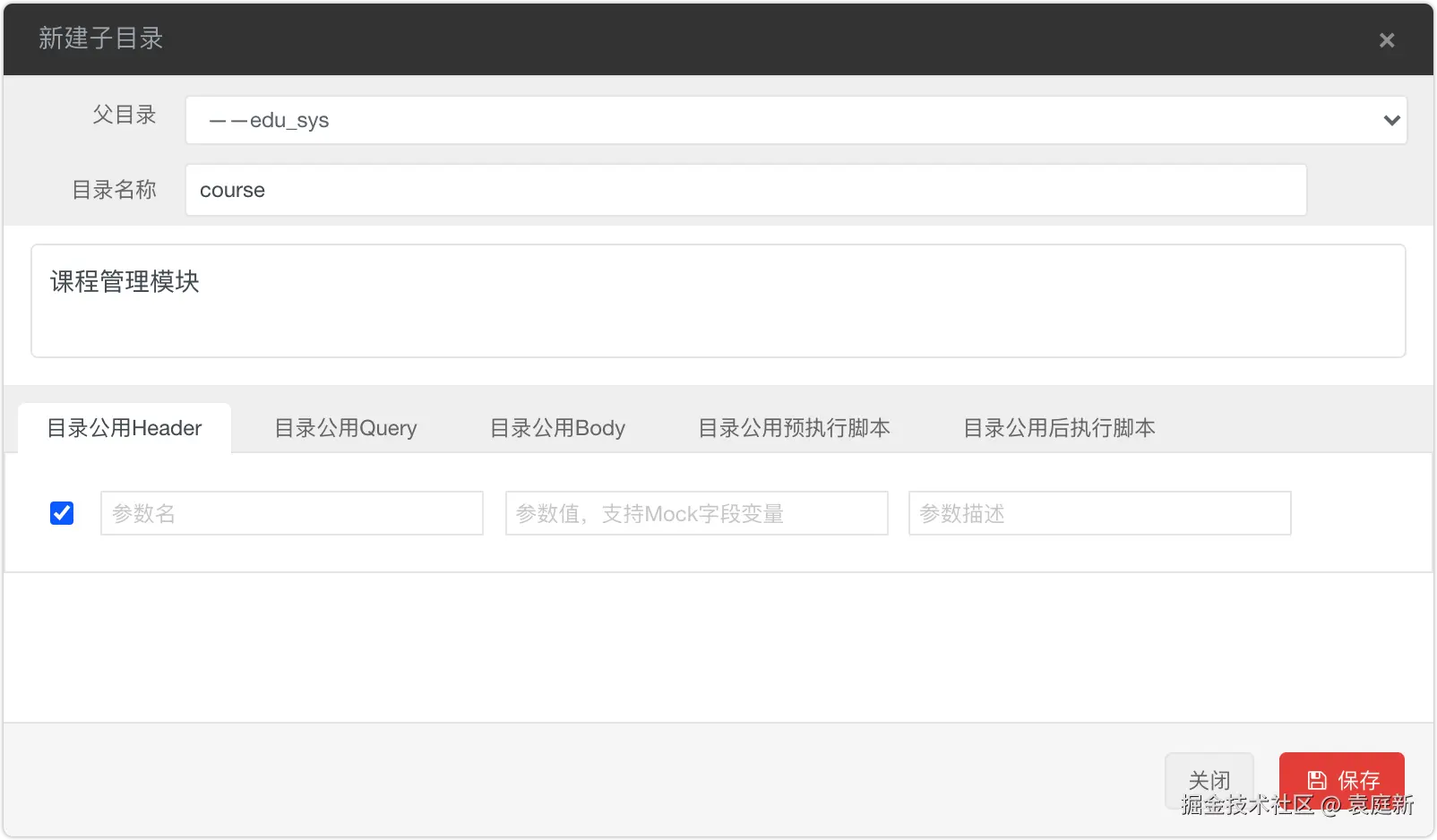 1.点击左侧的【新建目录】,例如,创建一个目录名称为【edu_sys】目录,用于管理当前项目下所有的接口。