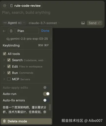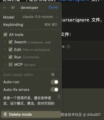 模型我选择了分析能力较强的 gemini-2.5-pro ,自动修复等能力关闭了(在方案规划阶段不需要),添加了相关角色提示词提升回复效果。同理,你可以根据自己的工作流程的不同阶段定制不同的模式。