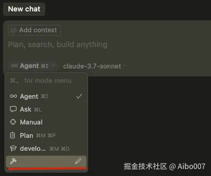 在 Cursor 中自带三种模式: Agent、Ask、Manual