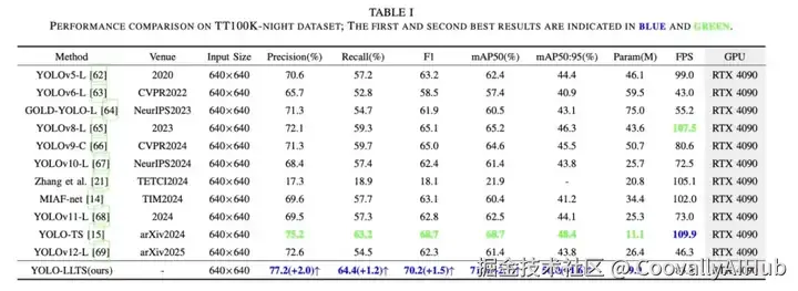 表3结果表明,在CCTSDB2021数据集上,尽管夜间训练数据占比较小,YOLO-LLTS仍以88.8%准确率(领先0.7%)、81.1%召回率(领先0.3%)及84.8 F1分数(领先0.5)全面领先。mAP50与mAP50:95分别达87.8%与57.5%,参数量10.2M时FPS高达93.6。