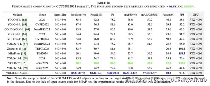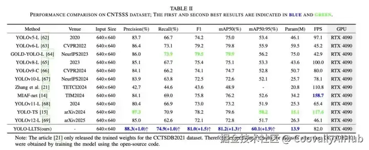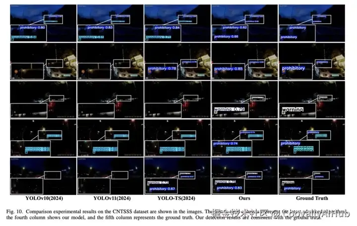 如图10所示,与2024年最新YOLO系列模型对比显示,YOLO-LLTS在CNTSSS数据集上实现零误检与零漏检,检测结果与真实标注完全吻合。