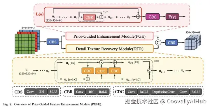 为解决这一挑战,我们提出先验引导特征增强模块(PGFE),替代YOLOv8原有的P0层。该模块将RGB图像从3通道扩展至64通道,在增强低光图像的同时为后续检测提供先验知识。模块由先验引导增强(PGE)与细节纹理恢复(DTR)两个核心组件构成。