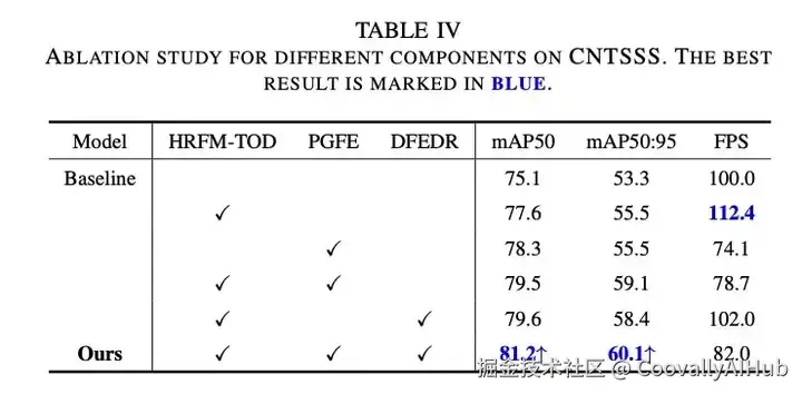 为验证各模块有效性,我们在CNTSSS数据集上以mAP50与mAP50:95为指标进行对比: