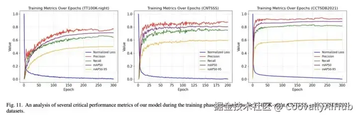 图11展示三个数据集上归一化损失、精确率等关键指标随训练轮次的变化曲线。可见归一化损失(框损失、分类损失与分布焦点损失之和)随训练快速下降并趋于稳定,其他指标亦快速收敛,表明模型具有良好的训练稳定性。