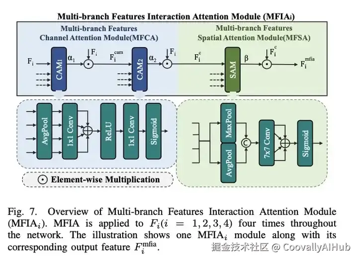 如图7所示,MFIA模块由多分支特征通道注意力(MFCA)与多分支特征空间注意力(MFSA)组成,可在通道与空间维度实现多特征高效交互。该模块在网络中被复用四次,图示展示其中一个MFIAii模块及其输出特征。