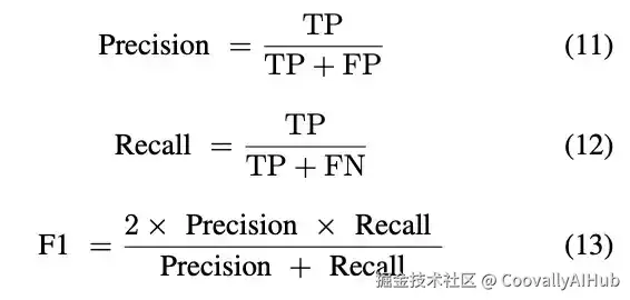 采用精确率(Precision)、召回率(Recall)、F1分数、mAP50、mAP50:95及帧率(FPS)作为评估指标。计算公式如下: