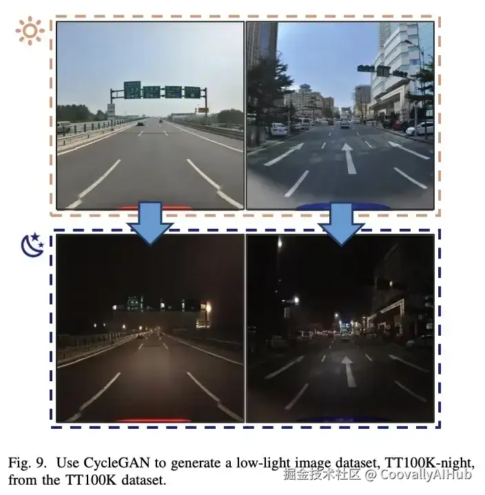 由清华大学-腾讯联合实验室整理的TT100K数据集经Zhu等方法改造,剔除样本量少于100的类别后保留45类。训练集含6,105张图像,测试集3,071张,分辨率均为2048×2048像素。如图9所示,我们采用CycleGAN对TT100K进行数据增强以提升评估准确性。