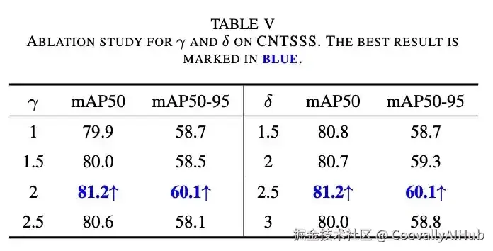 该模块使mAP50提升3.2%,与HRFM-TOD联合使用时mAP50与mAP50:95分别提升4.4%与5.8%。实验表明当公式参数γ=2、δ=2.5时模型性能最优。