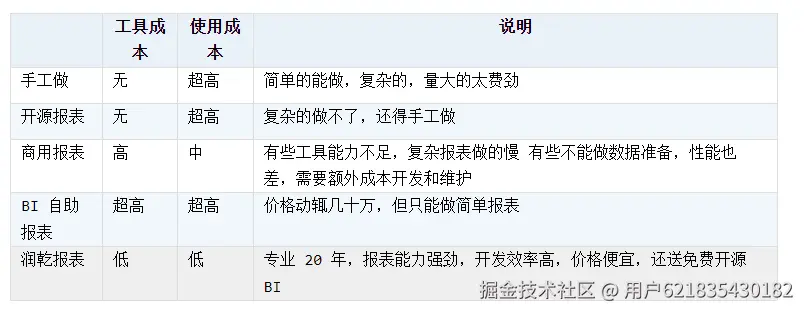能做报表的工具有挺多,商用工具,开源工具,BI 自助报表,这些都号称可以做报表,当然也有不用工具,手工开发的