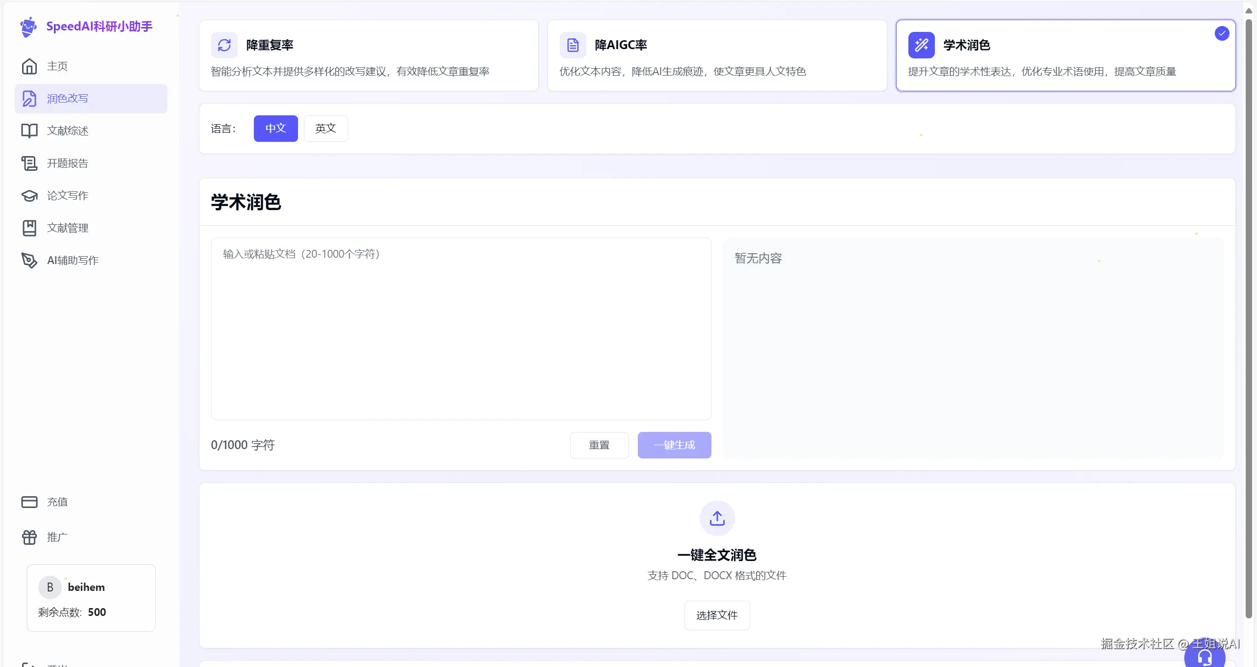 最后说说SpeedAI,它提供智能降重、降AI检测率功能,就像一位专业的“技术宅”,专注于解决AI率的问题。它支持中文和英文,无论是中文文章还是英文文章,它都能一展身手。降后内容还能够在历史记录中查看和下载,方便你随时查阅和使用,就像给你一个专属的“降重资料库”。