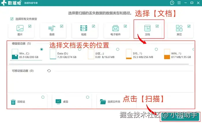 步骤1:打开软件,便会进入到文件的扫描准备页面,在上面选择文件类型和扫描位置,点击【扫描】;