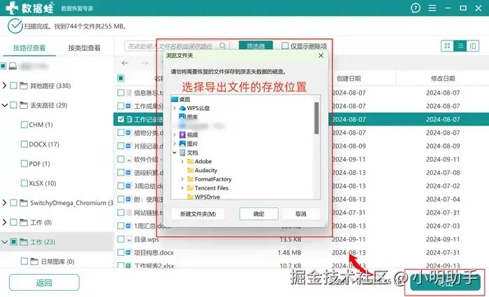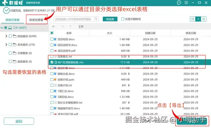 步骤2:等待软件显示【扫描完成】后,在指定的位置上选择出自己需要恢复的excel文件(可以通过左边的目录选择excel格式)后,点击【导出】;