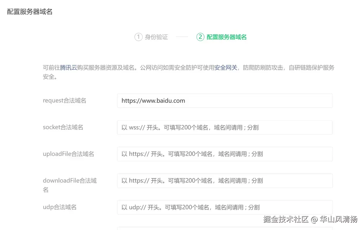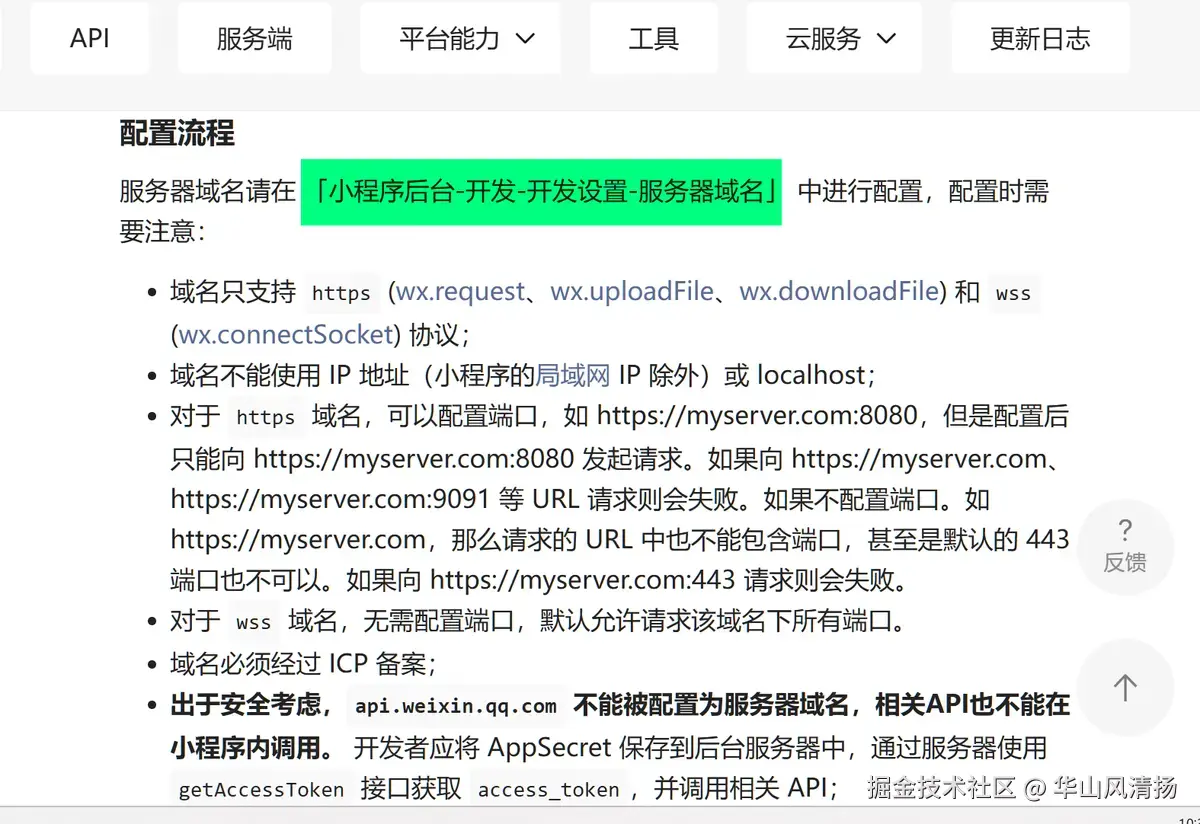 幸好微信小程序 API 还算良心,在错误消息的 response 里给了一个超链接,指向了一个官方文档,讲清楚了这个错误,是因为在 小程序后台-开发-开发设置-服务器域名里缺少配置: