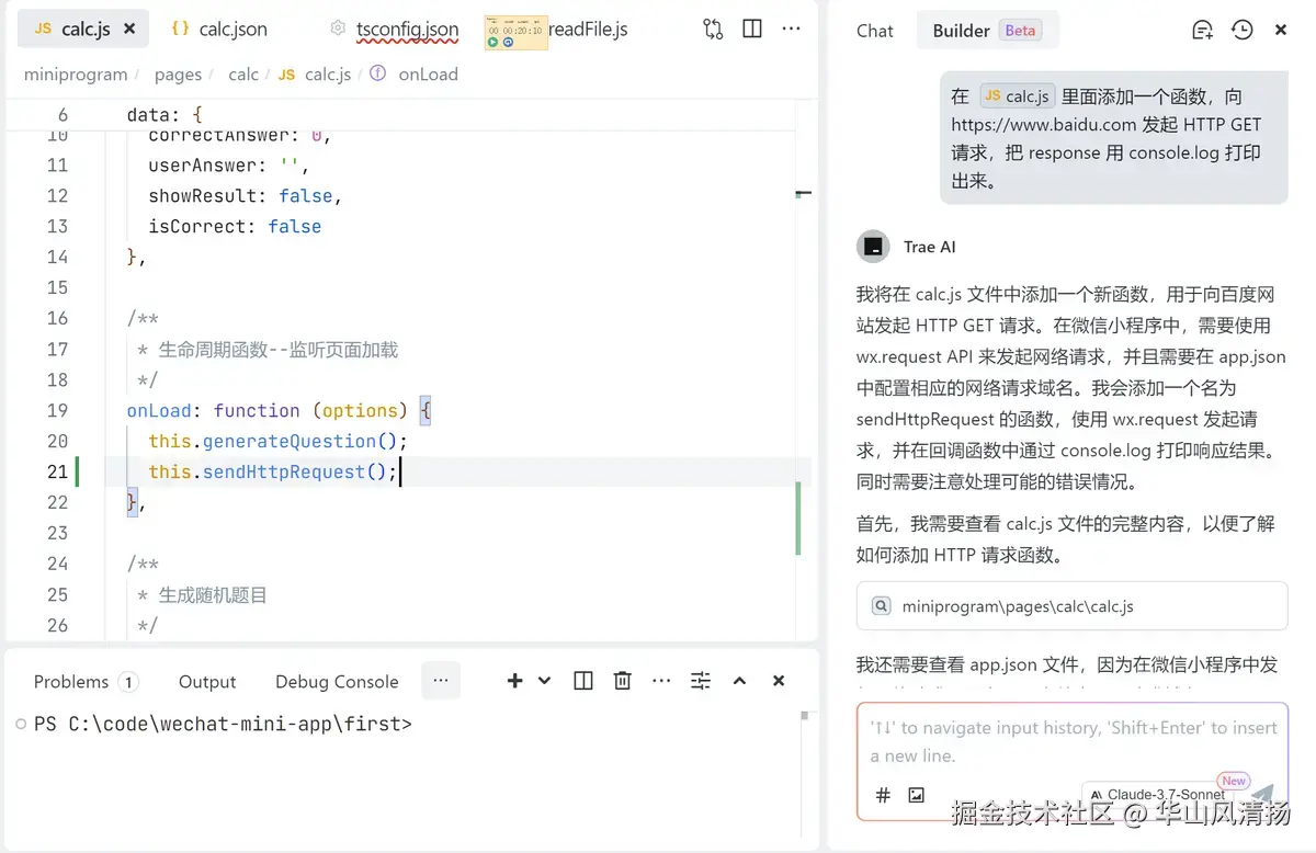 笔者之前的文章使用 Trae 快速上手微信小程序开发提到,我作为一个后端开发者,在 Trae 的帮助下,在几分钟之内,就生成了一个能够随机出三位数之内加减法的微信小程序,给我一年级的儿子用是绰绰有余了。