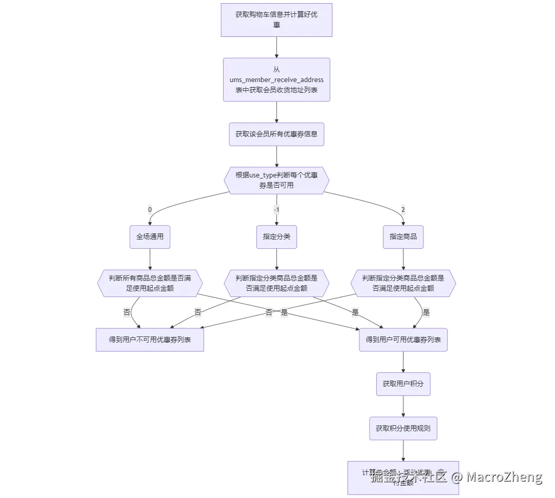 A[获取购物车信息并计算好优惠] --> B(从ums_member_receive_address表中获取会员收货地址列表)