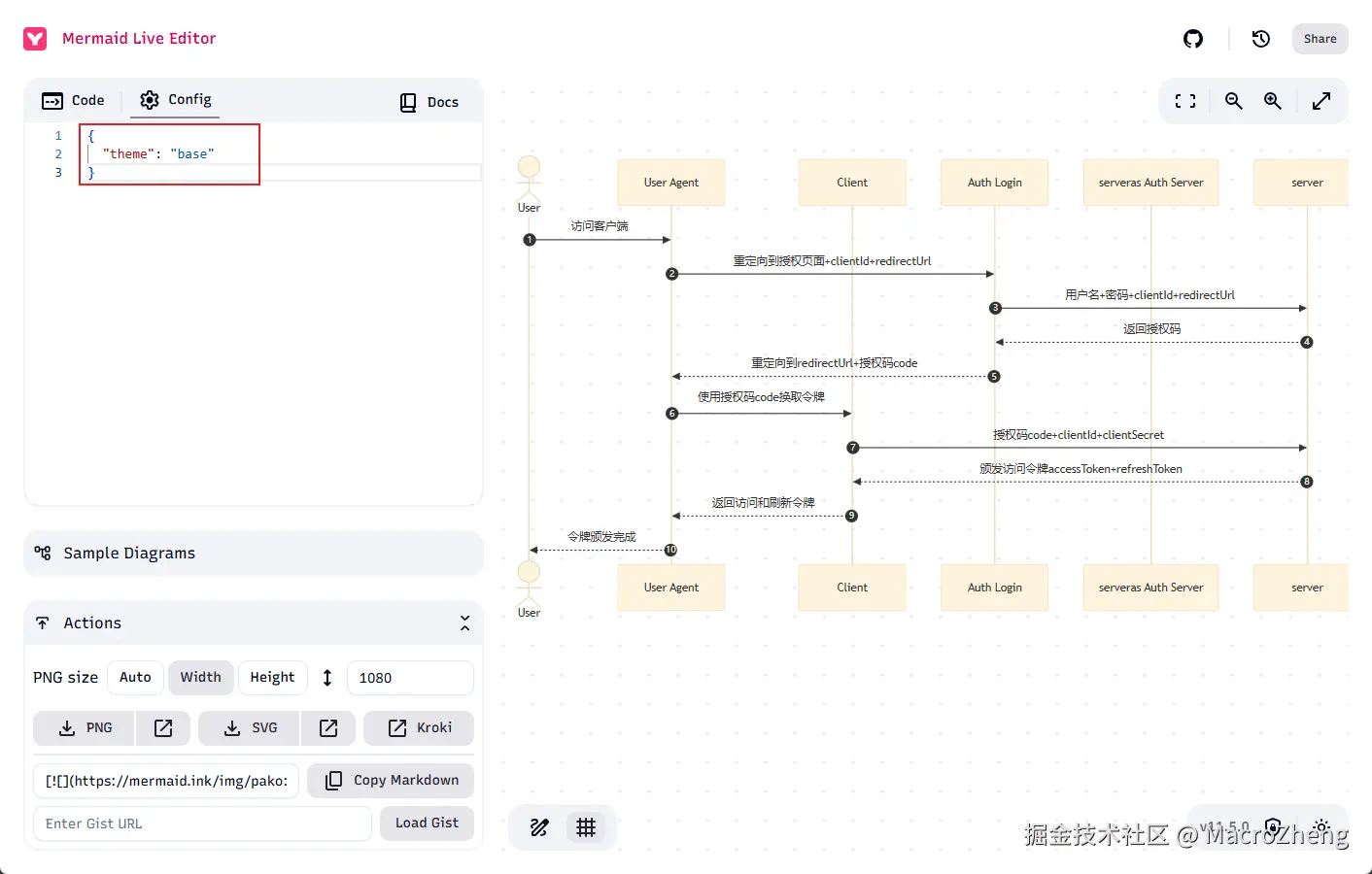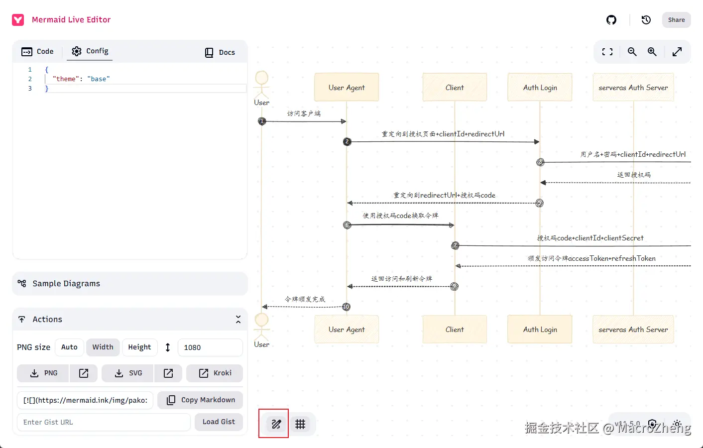 时序图(Sequence Diagram),它通过描述对象之间发送消息的时间顺序显示多个对象之间的动态协作。我们在学习Oauth2的时候,第一步就是要搞懂Oauth2的流程,这时候有个时序图帮助可就大了。下面我们使用Mermaid来绘制Oauth2中使用授权码模式颁发令牌的时序图。