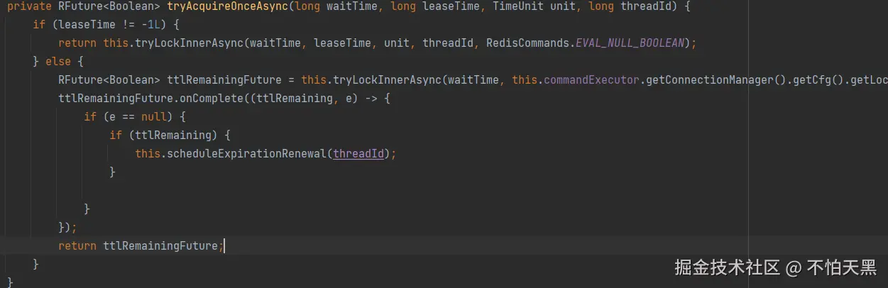 如果没有设置锁的过期时间,则会进入else的执行逻辑,获取看门狗的默认过期时间(30秒),并设置相应的回调函数