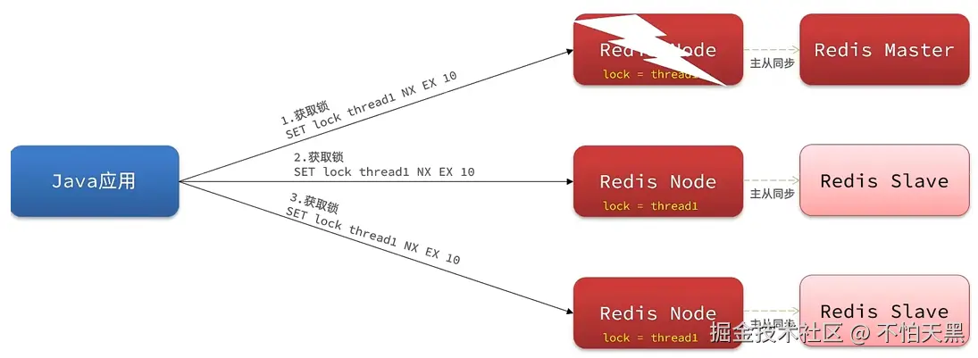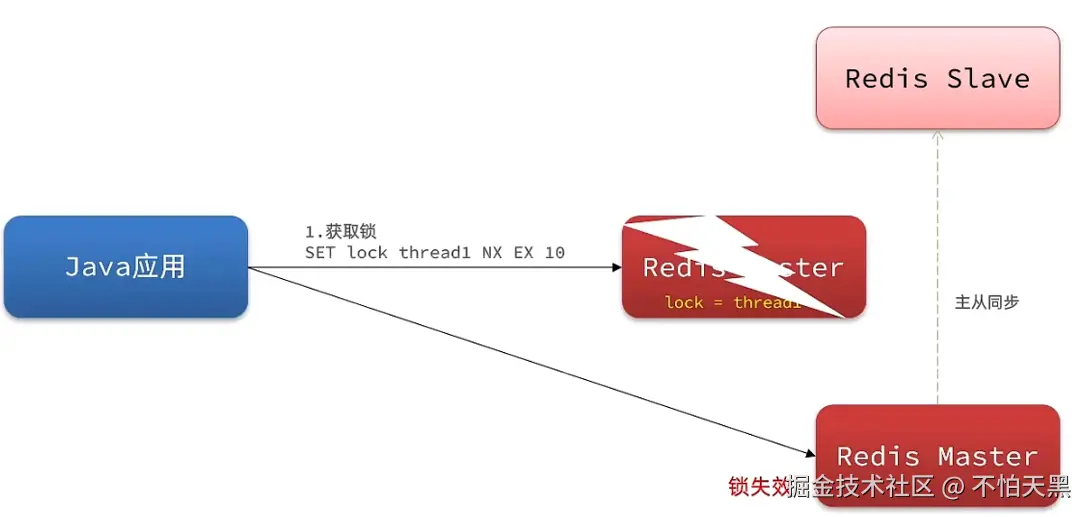 redis主从模式下,由于主从节点的数据同步有一定延迟,导致主节点成功设置了锁,但是还没有将锁的信息同步到从节点,这时候如果有其它线程在从节点上发现没有锁的相关信息,则也会获取到锁