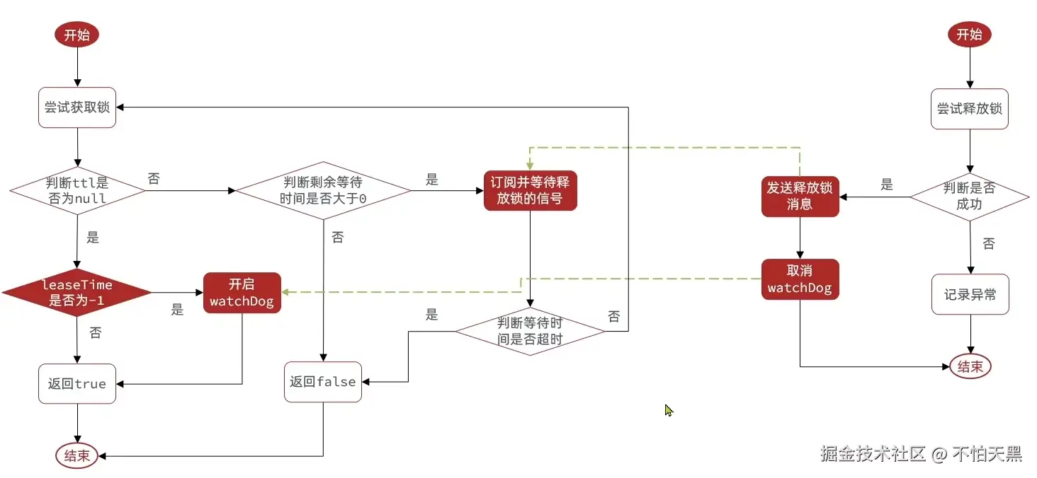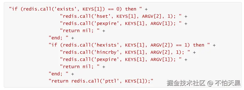 整个执行逻辑为,首先通过大key判断当前需要获取的锁是否存在,如果不存在则将锁的标识设置为当前线程,同时将重入次数设置为1,最后设置锁的超时时间,pexpire表示以毫秒为单位设置过期时间