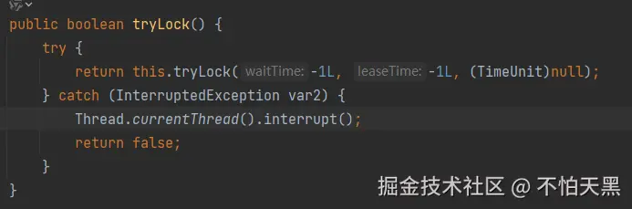 通过redissonClient.getLock获取到redisson分布式锁,其中有一个tryLock方法用于尝试获取锁