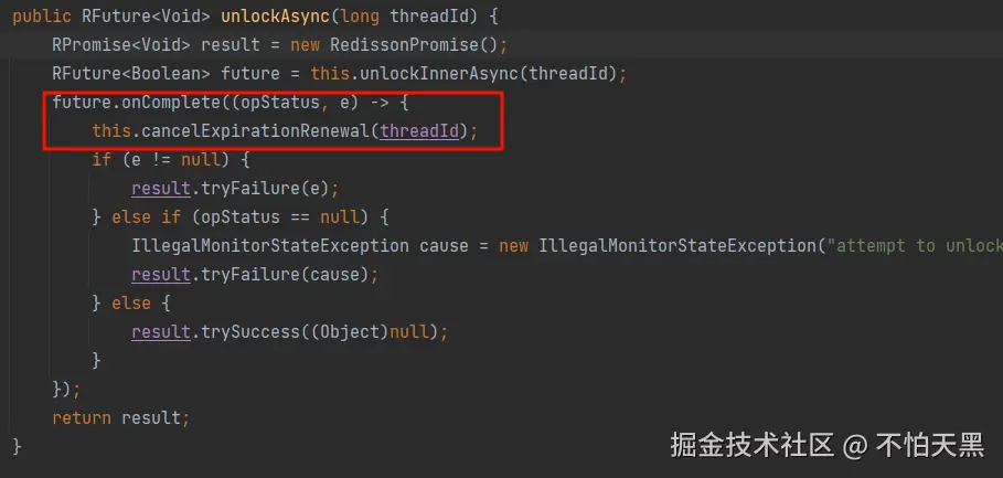 RFuture<Boolean> future = RedissonLock.this.renewExpirationAsync(threadId);