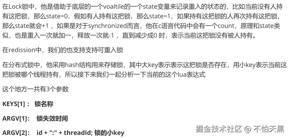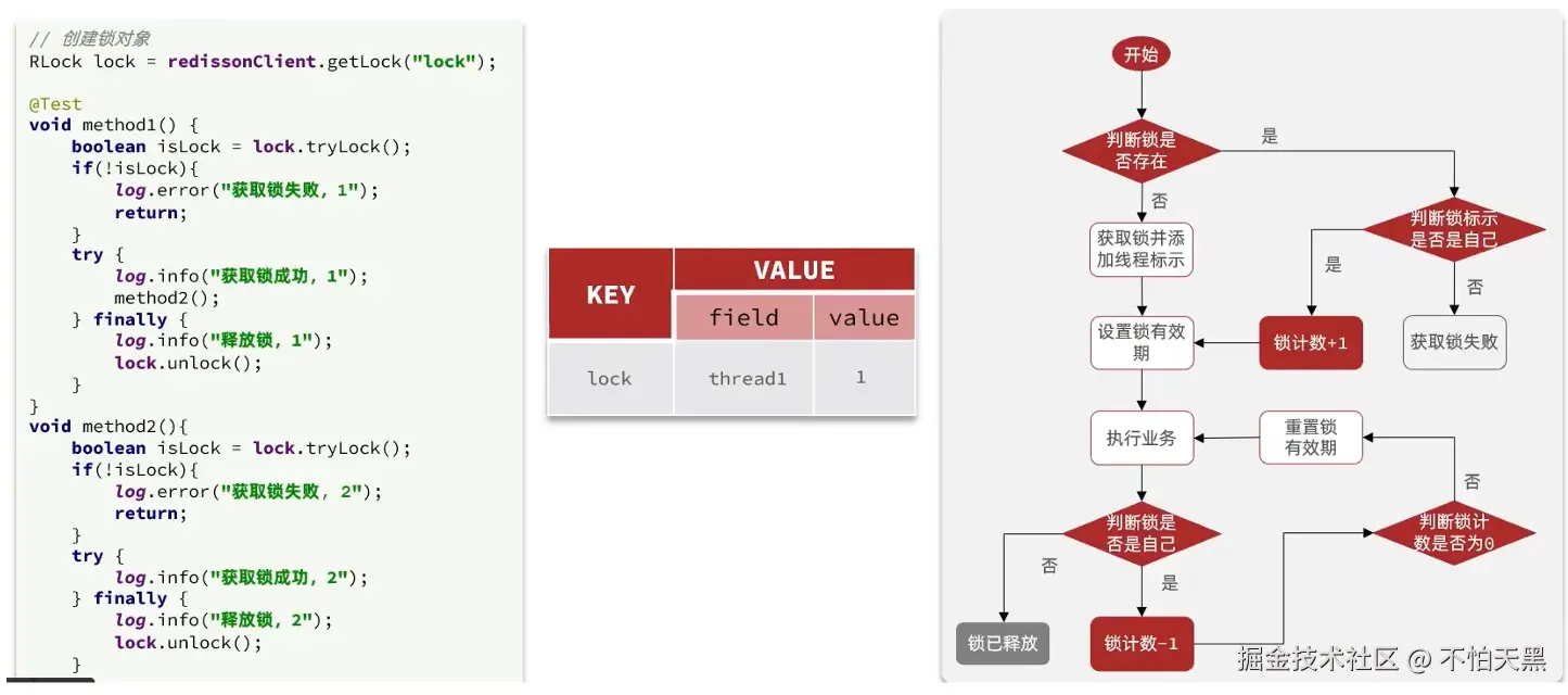 具体来说,在redis中使用hash来存储锁的信息,包括锁名称,当前持有锁的标识(由线程id组成)以及锁的重入次数