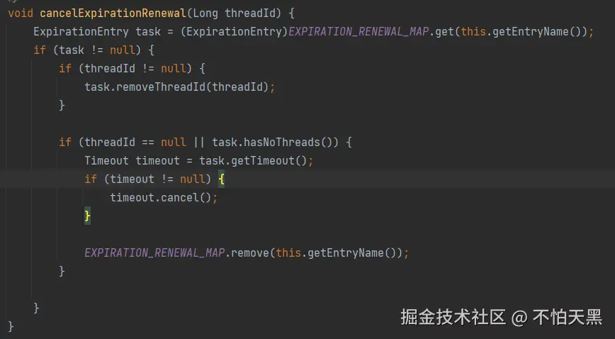 因为ExpirationEntry存储了线程id以及对应的锁重入次数,同时存储了该锁对应的一个用于续约的延时任务