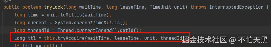 Long ttl = this.tryAcquire(waitTime, leaseTime, unit, threadId);