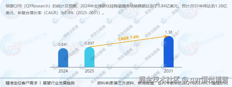 碳化硅陶瓷膜是一种采用重结晶技术在高温条件下烧结而成的多孔过滤材料,其多孔支撑层、过渡层、膜层全部由碳化硅材料构成,具有耐腐蚀、耐高温、亲水性强等特点。碳化硅陶瓷膜的过滤精度涵盖微滤和超滤,能够以高通量连续地去除颗粒、油滴和乳状液以及悬浮固体,提供优质的液体过滤。根据QYResearch最新调研报告显示,2024年,全球碳化硅陶瓷膜市场销售额达到0.84亿美元,预计2031年将达到1.38亿美元,年复合增长率(CAGR)为7.4%(2025-2031)。