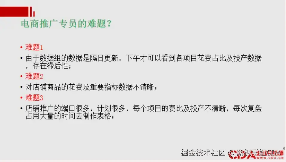 然而,电商数据分析也面临诸多挑战。数据组数据隔日更新,导致数据时效性差,影响问题的及时分析和处理;商品花费和重要指标数据不清晰,难以深入了解业务情况;店铺推广端口和计划繁多,数据整理和表格制作耗费大量时间。
