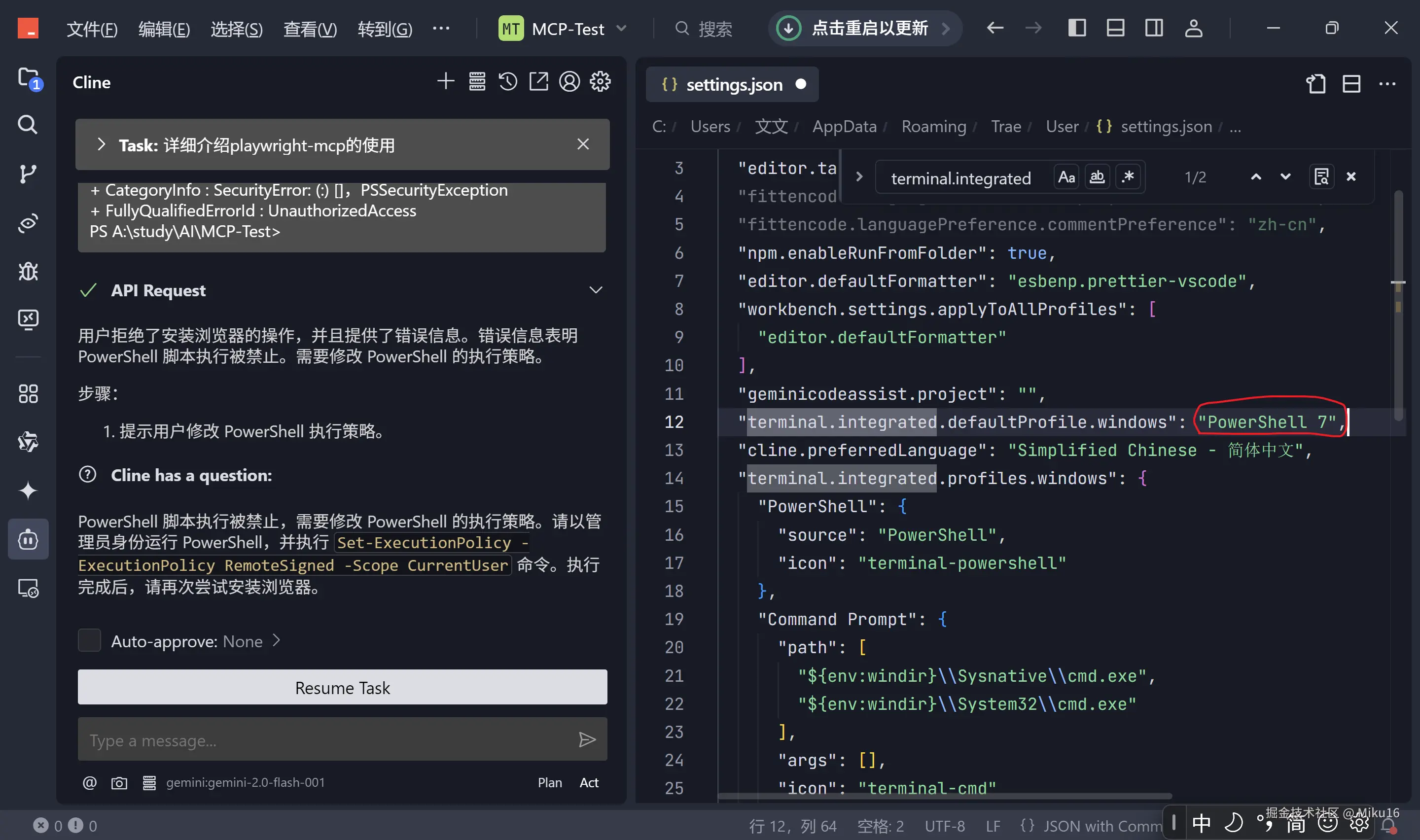 cline_mcp_settings.json中正确设置启动命令和参数,并配置autoApprove以简化操作。 - 解决环境问题: 升级 PowerShell 至 7.0 以上版本并配置执行策略(