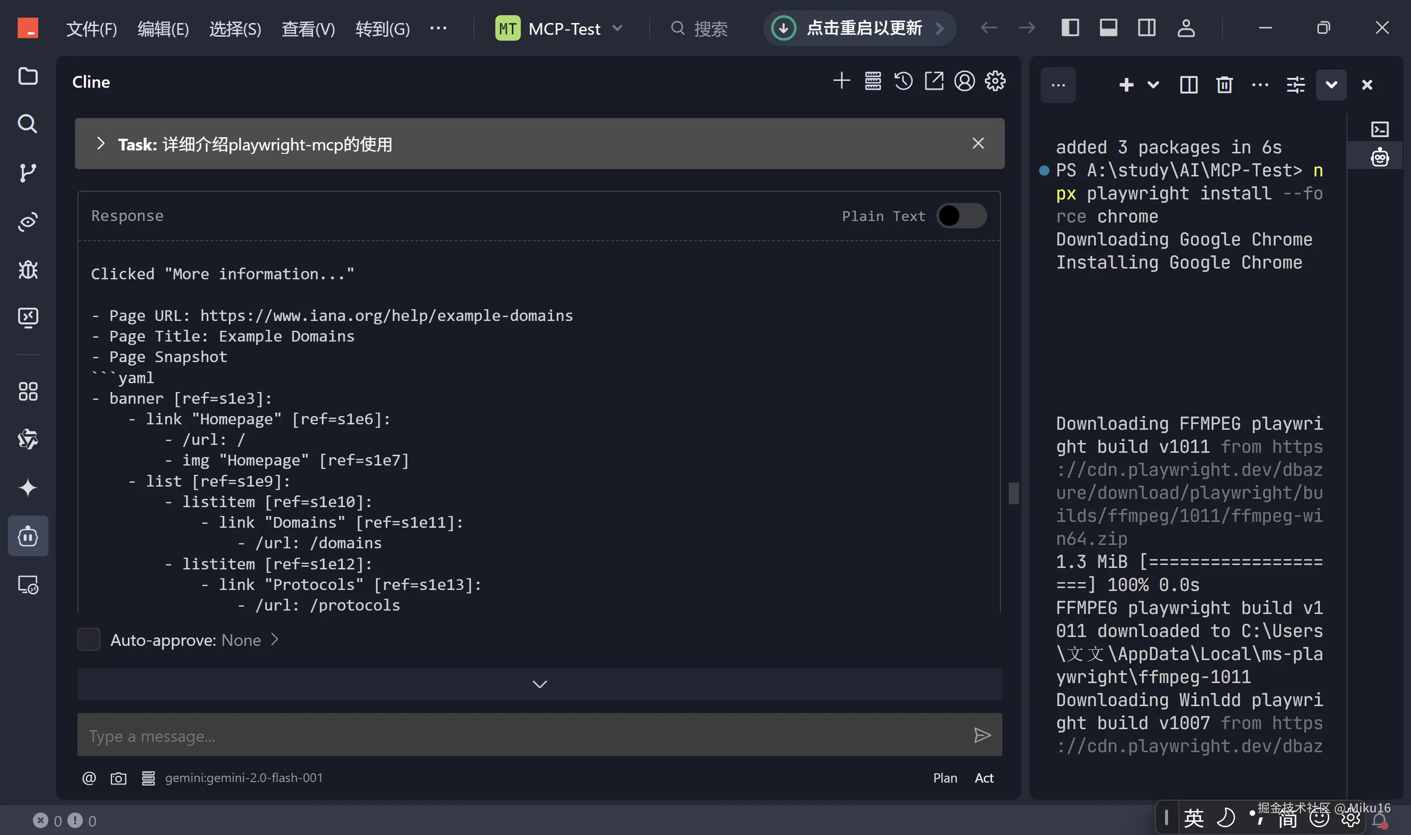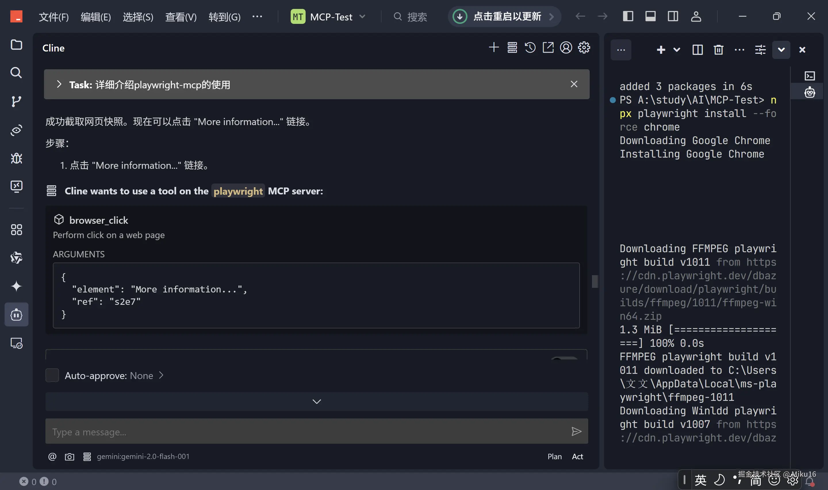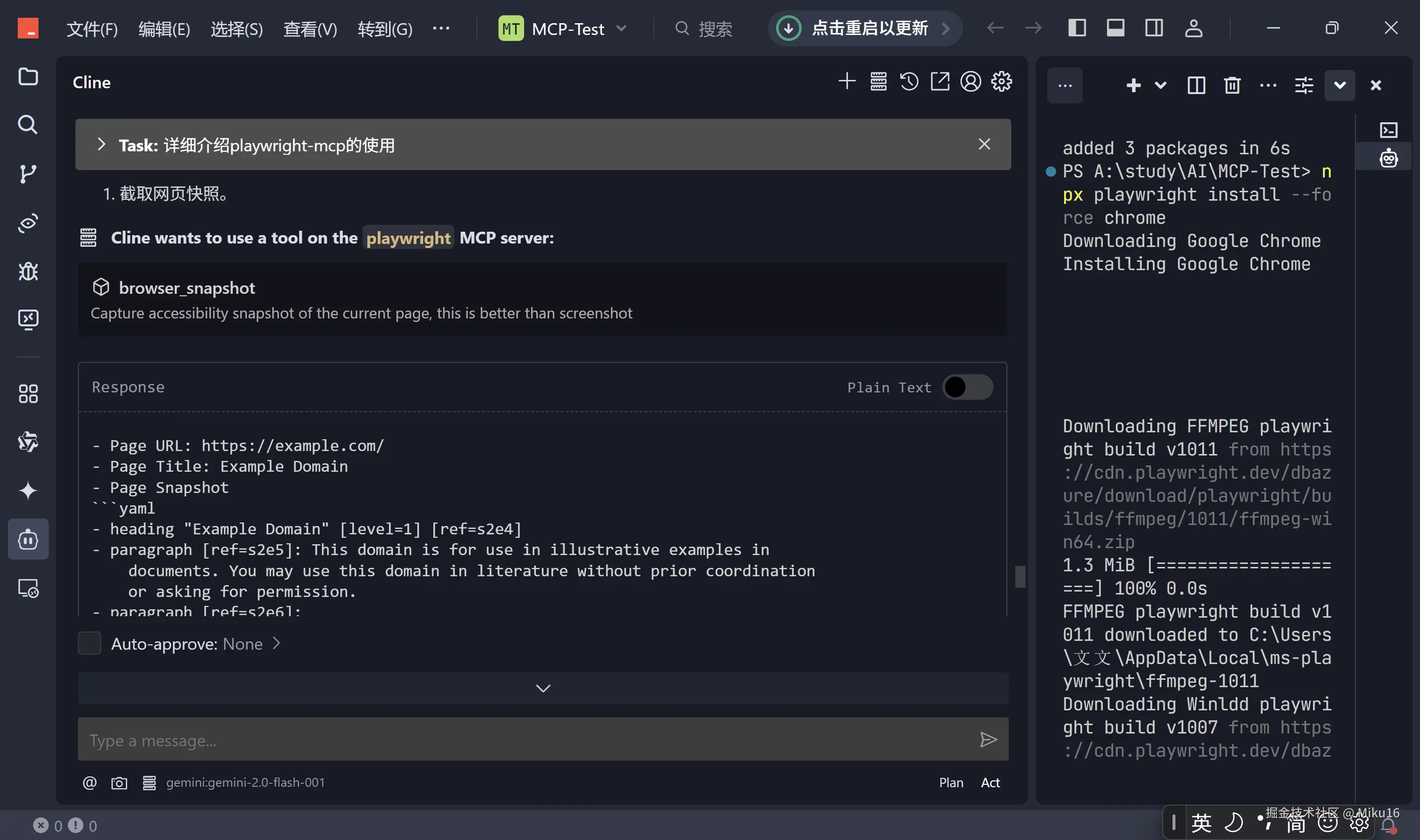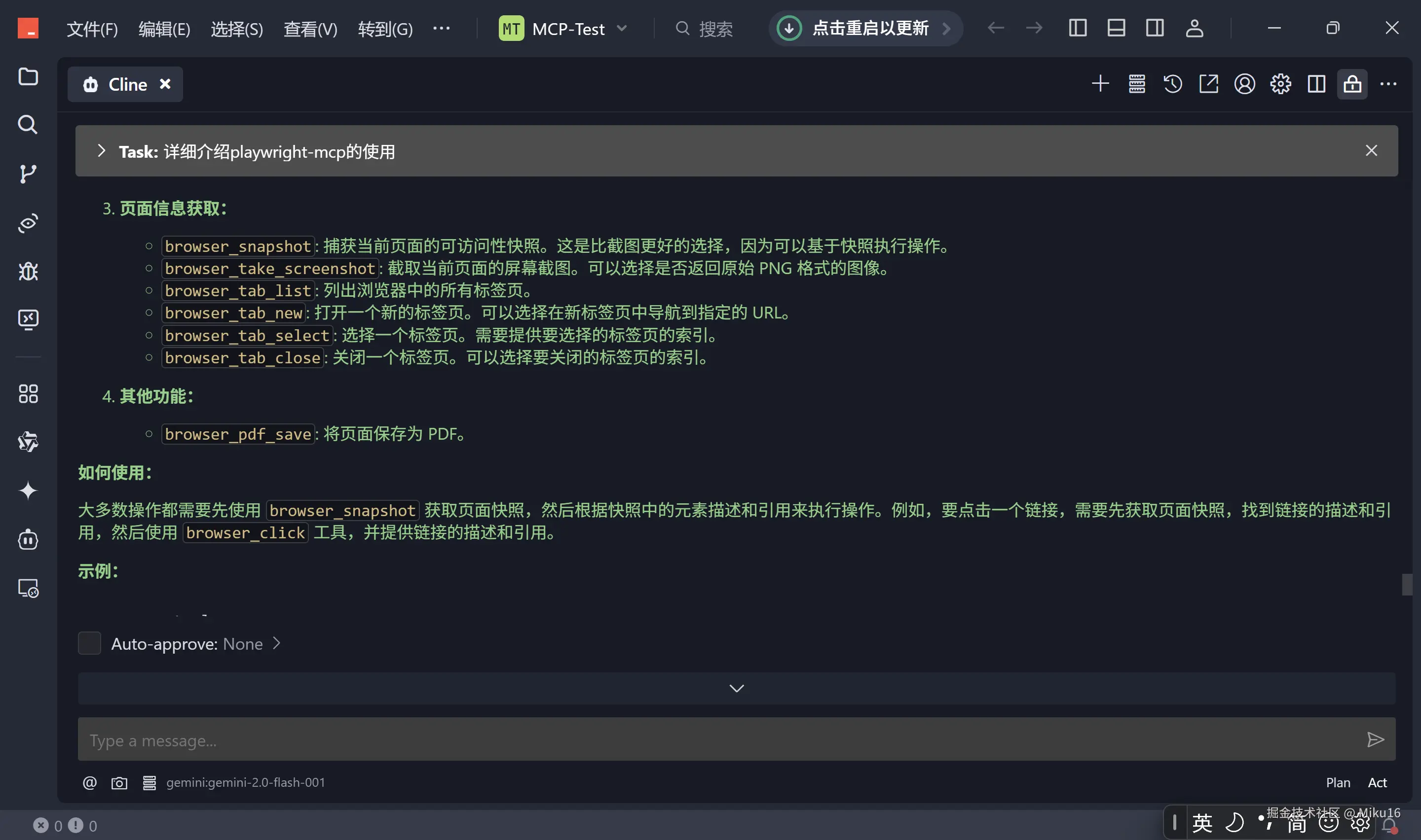 browser_snapshot获取当前页面状态和可交互元素信息,然后根据快照信息调用browser_navigate,browser_click,browser_type等命令执行具体操作。 - 自动化演示: 通过一个具体的示例(搜索掘金用户、打开文章并保存为 PDF),展示了 AI 结合 Playwright-MCP 实现复杂浏览器自动化任务的能力。