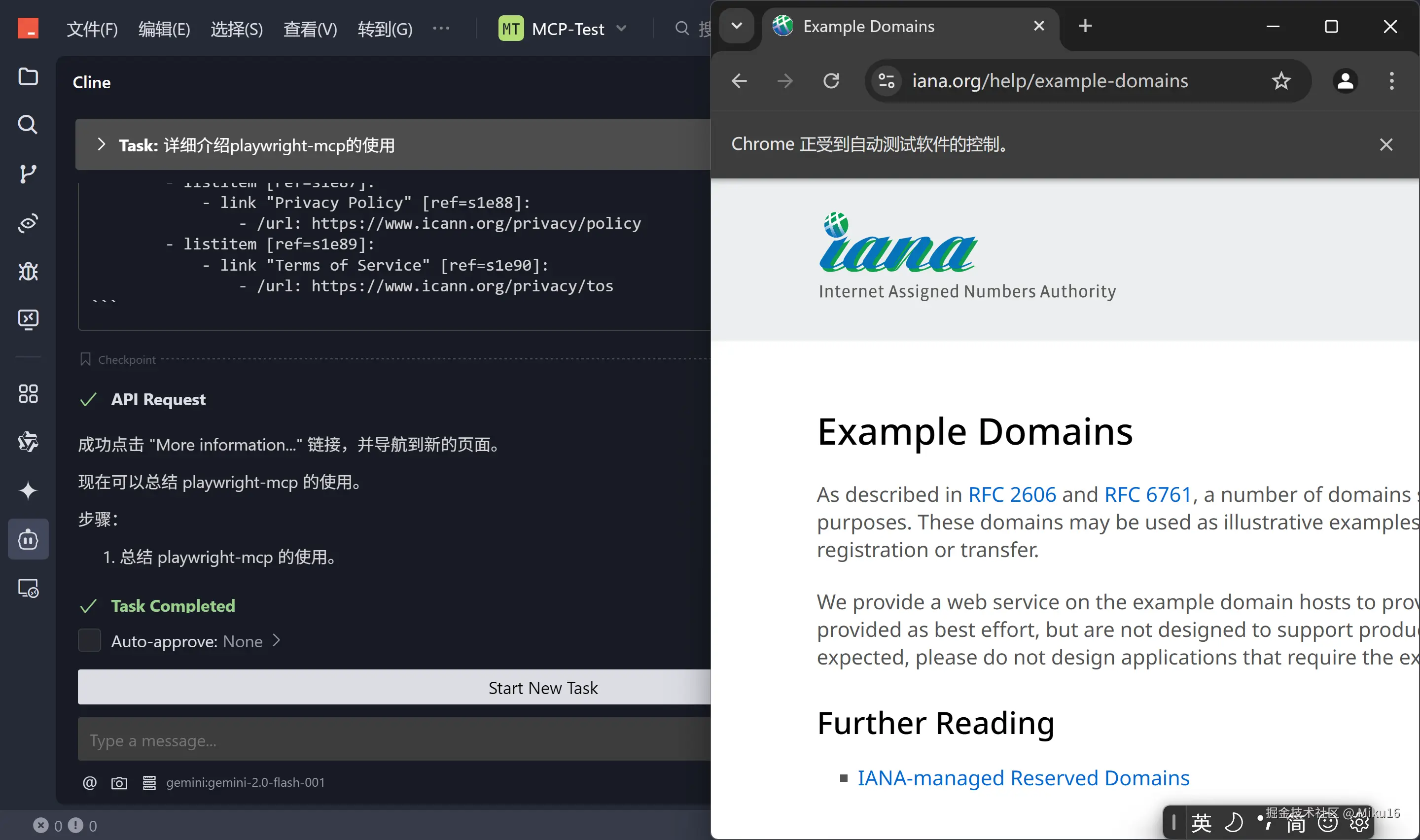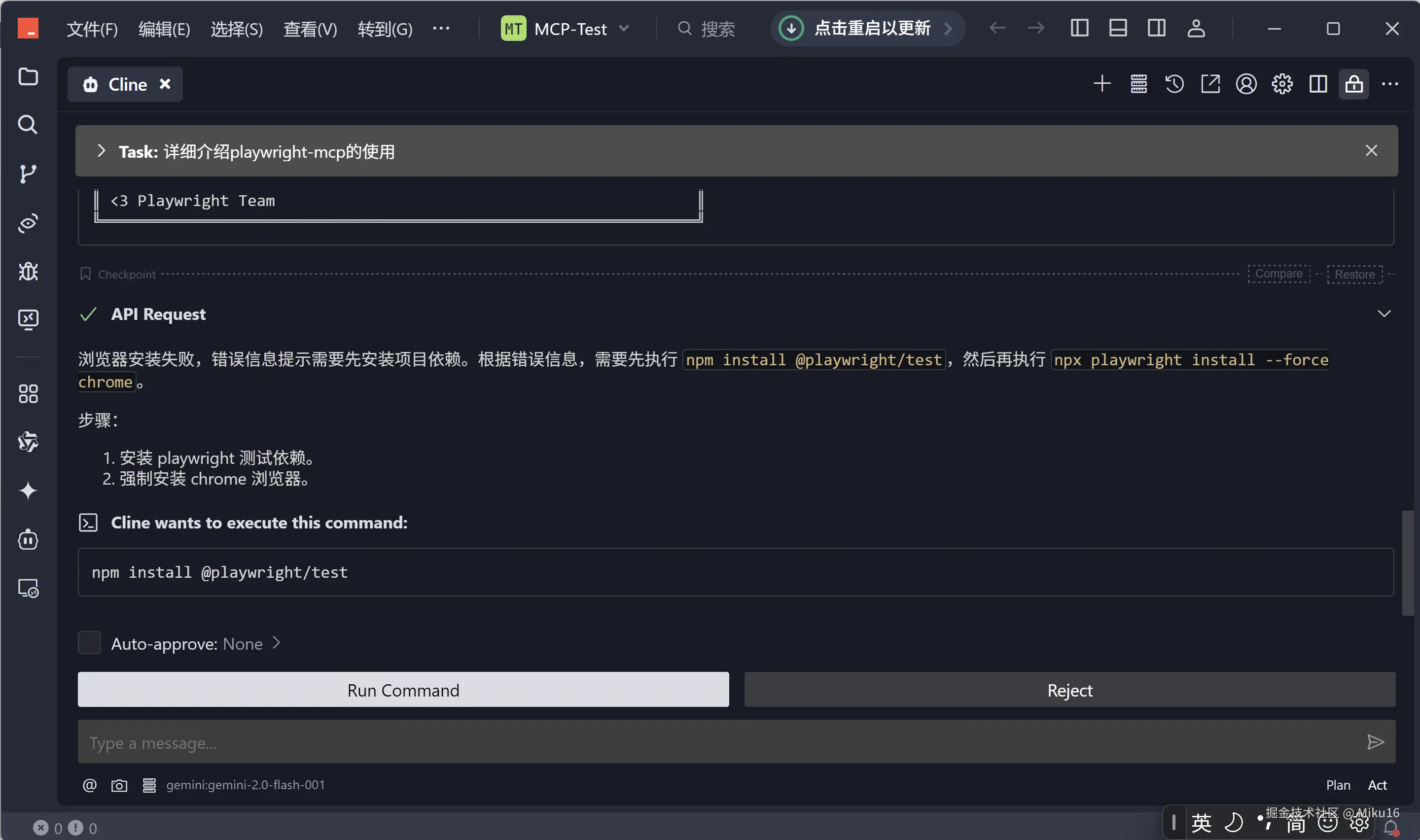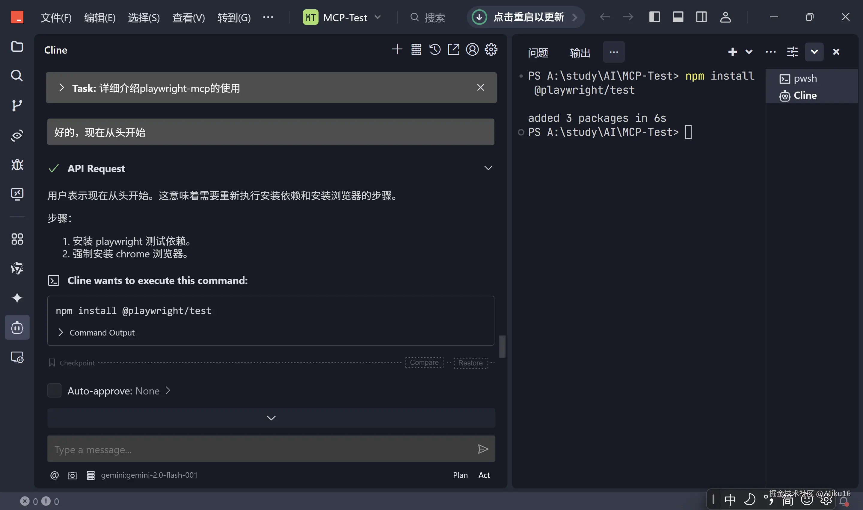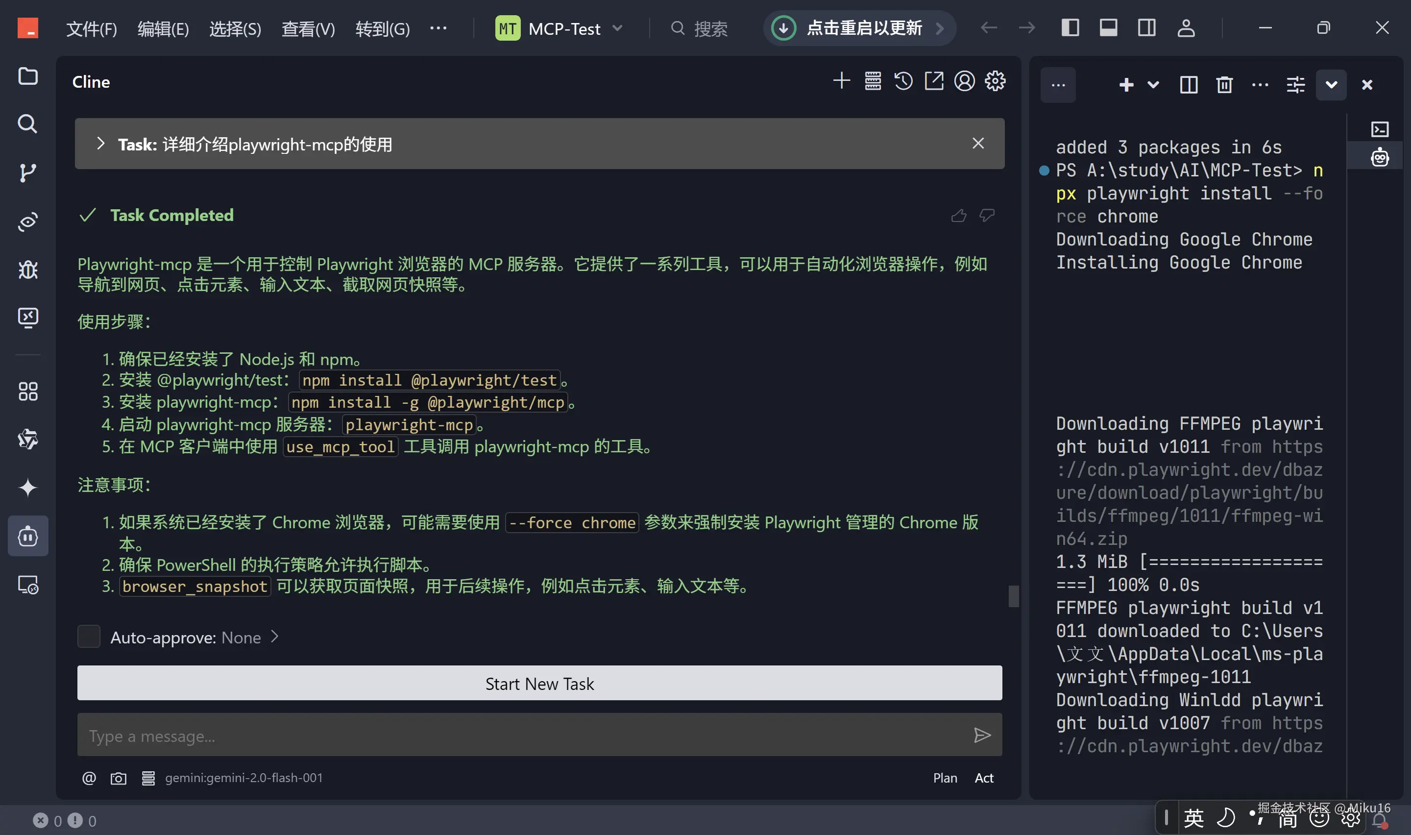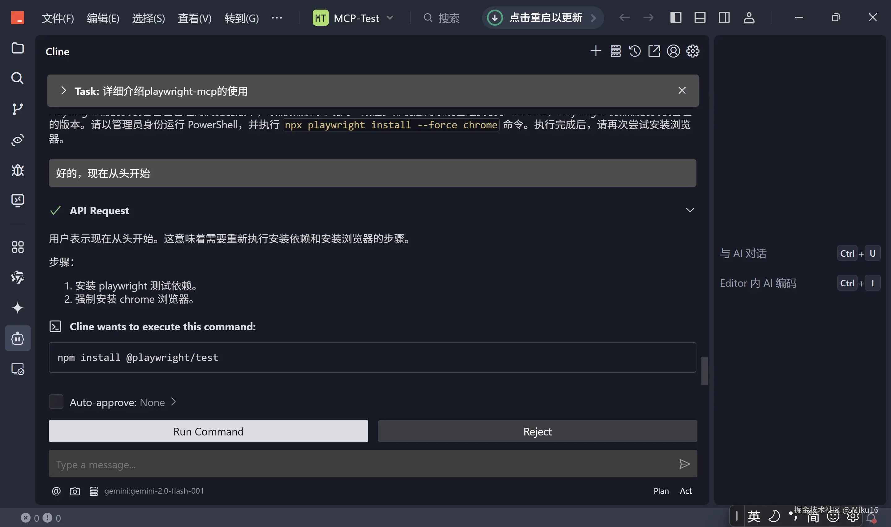 browser_snapshot获取当前页面状态和可交互元素信息,然后根据快照信息调用browser_navigate,browser_click,browser_type等命令执行具体操作。 - 自动化演示: 通过一个具体的示例(搜索掘金用户、打开文章并保存为 PDF),展示了 AI 结合 Playwright-MCP 实现复杂浏览器自动化任务的能力。