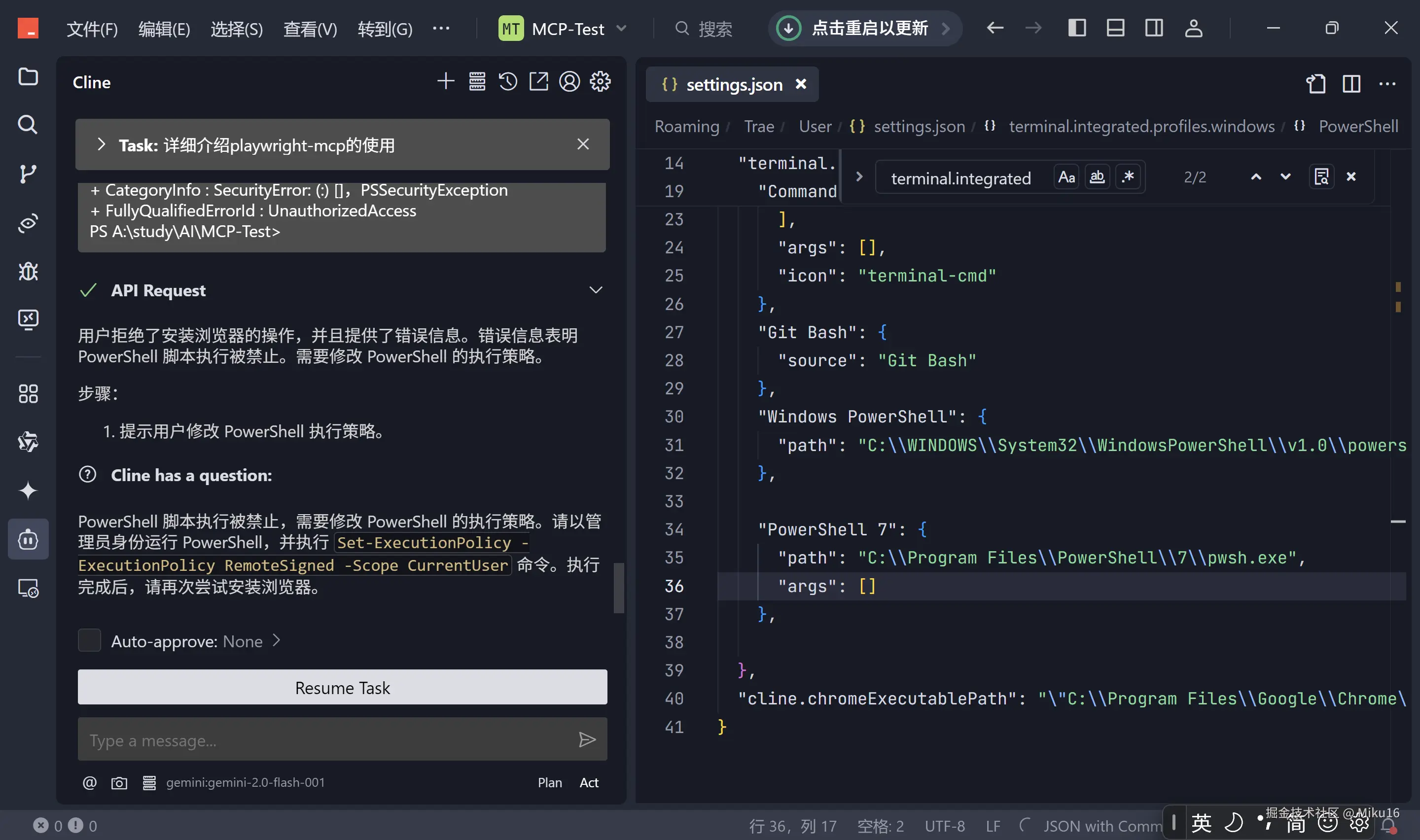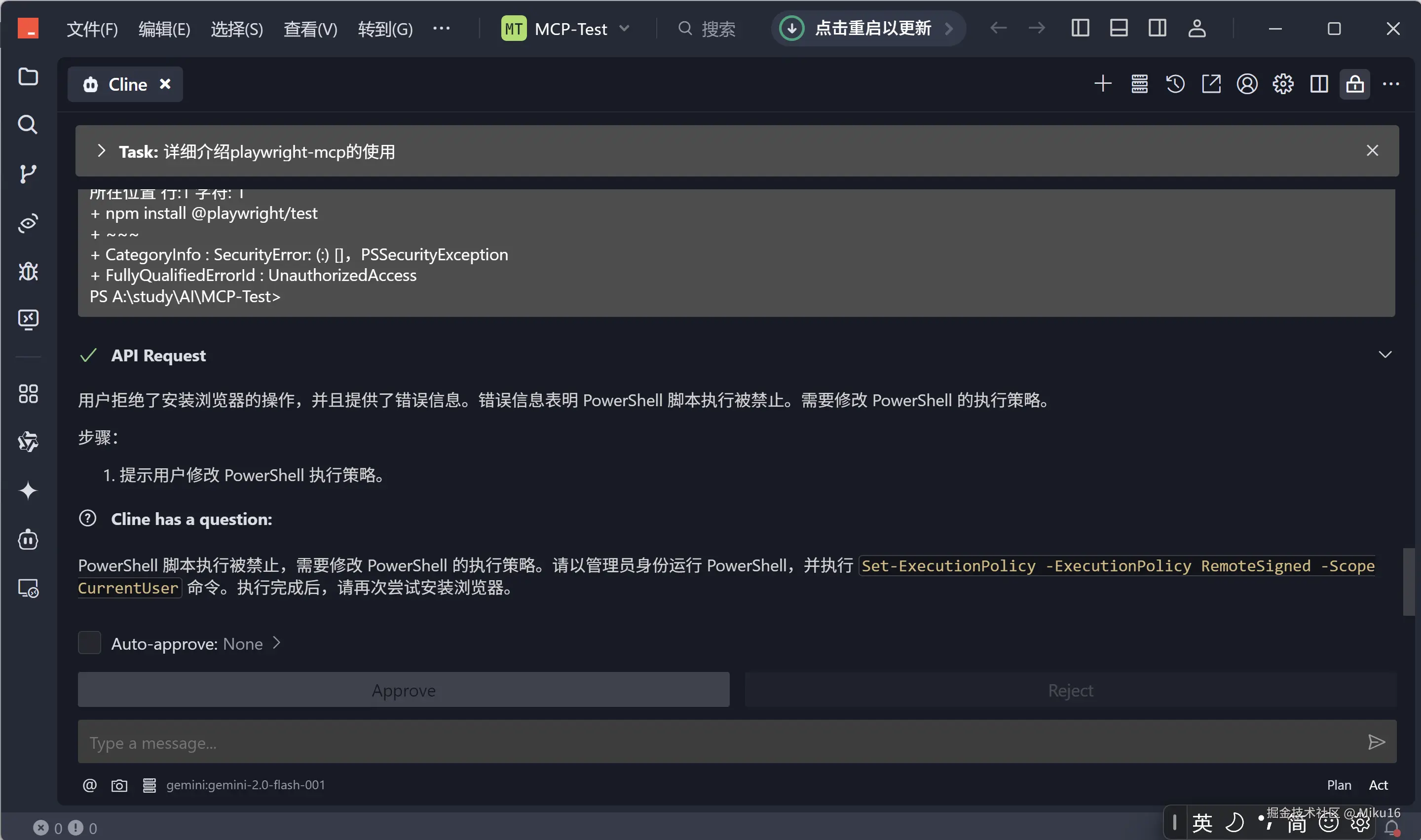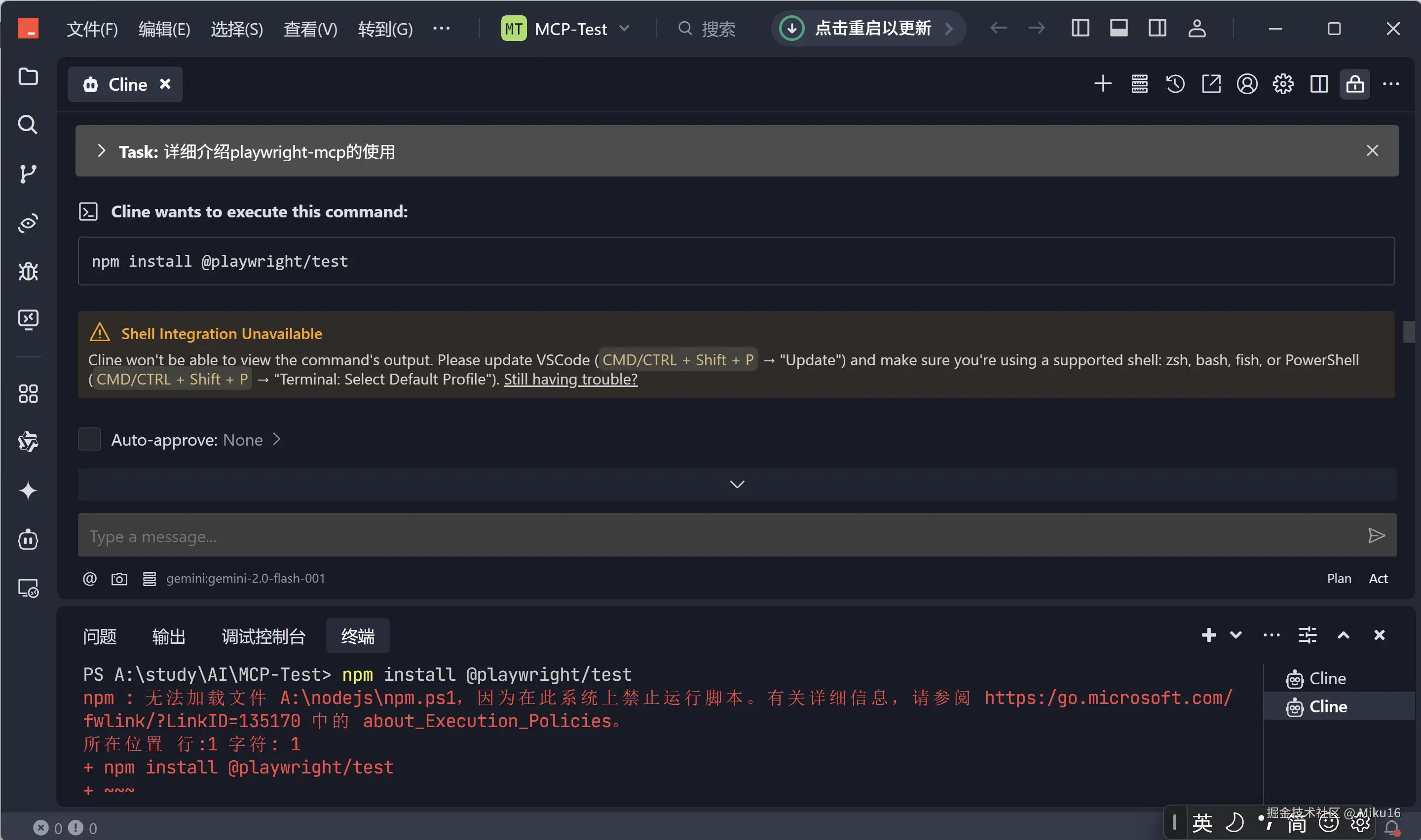 npm脚本被禁止执行,运行失败。并且Cline无法读取到命令行的输出结果。