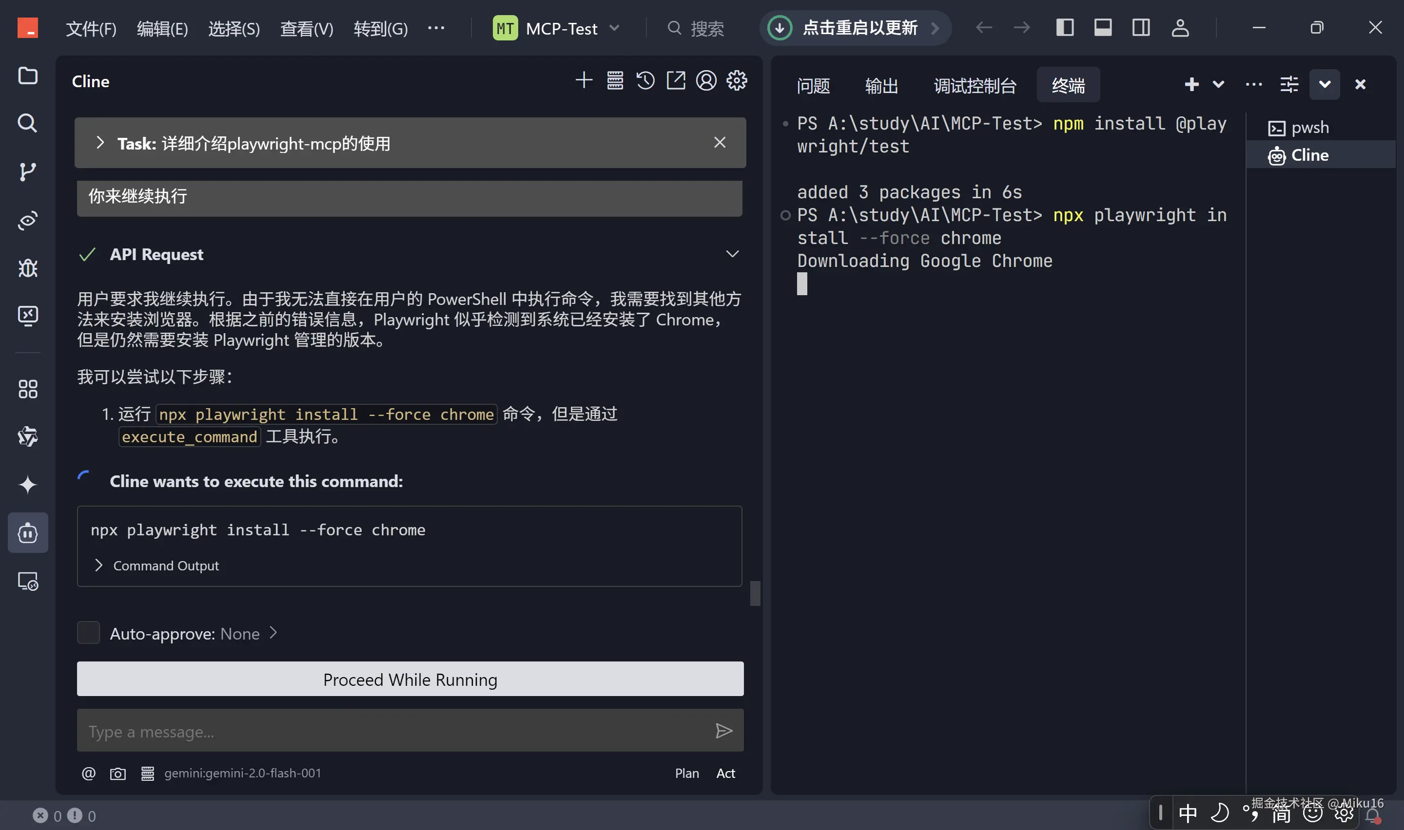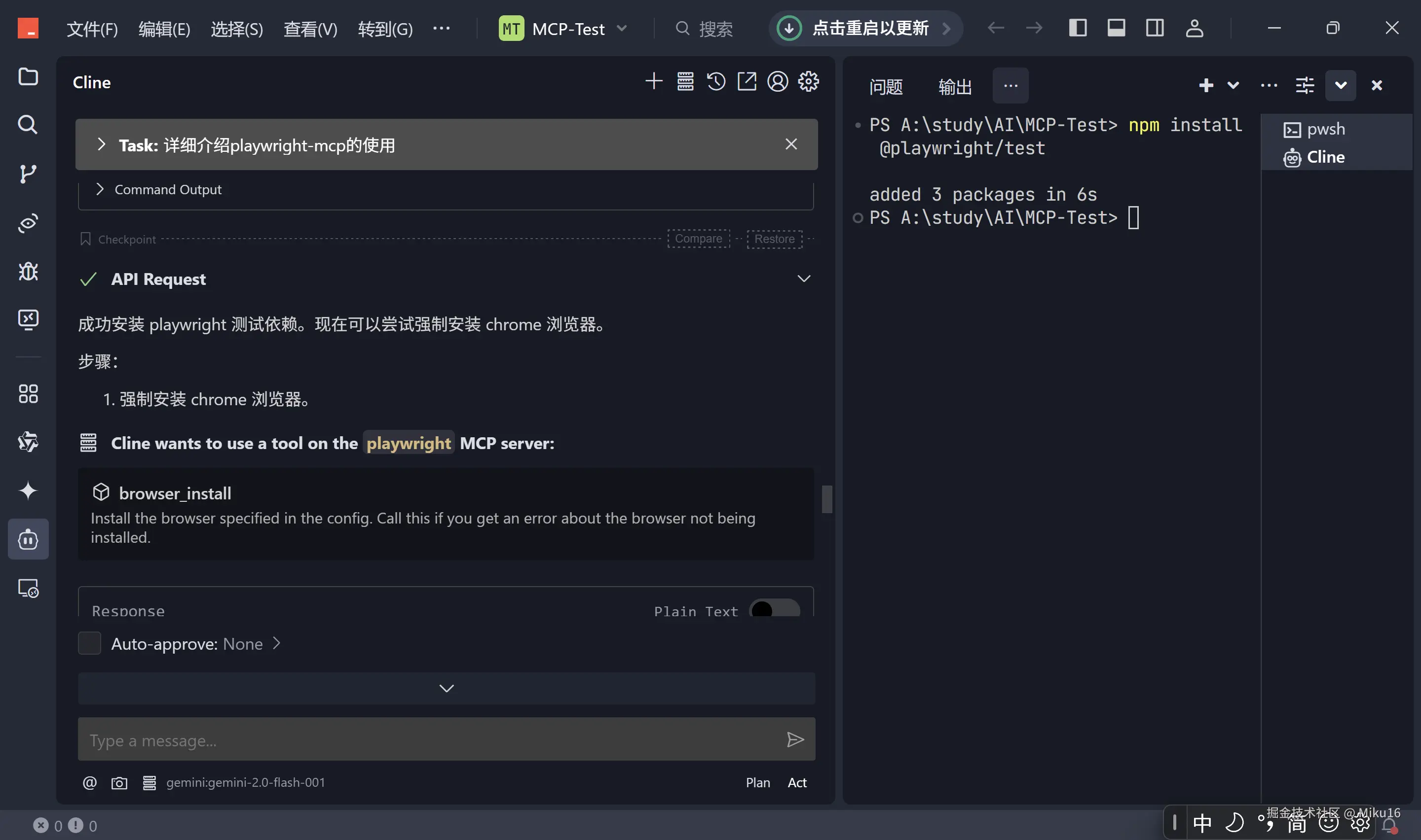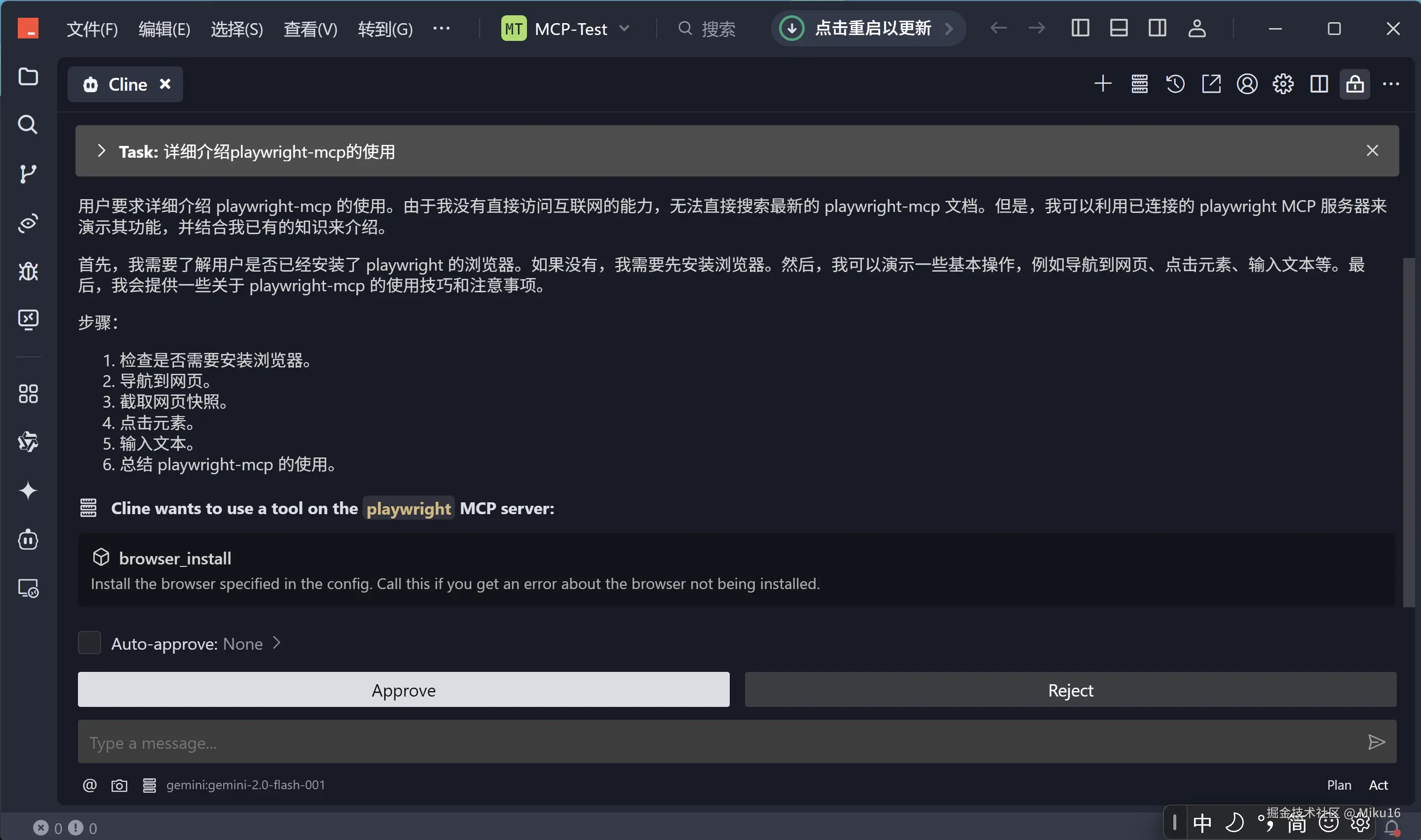 视频中将上述命令发给AI,并且设置Auto-approve开启了自动执行,从而实现AI调用playwright的工具对chrome进行自动化操作。