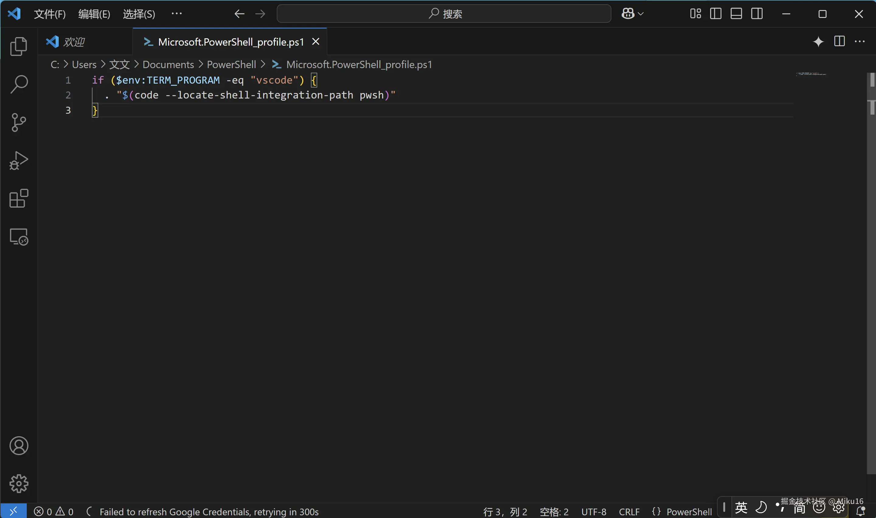 手动配置Shell集成。用 pwsh方式打开PowerShell,输入以下命令: