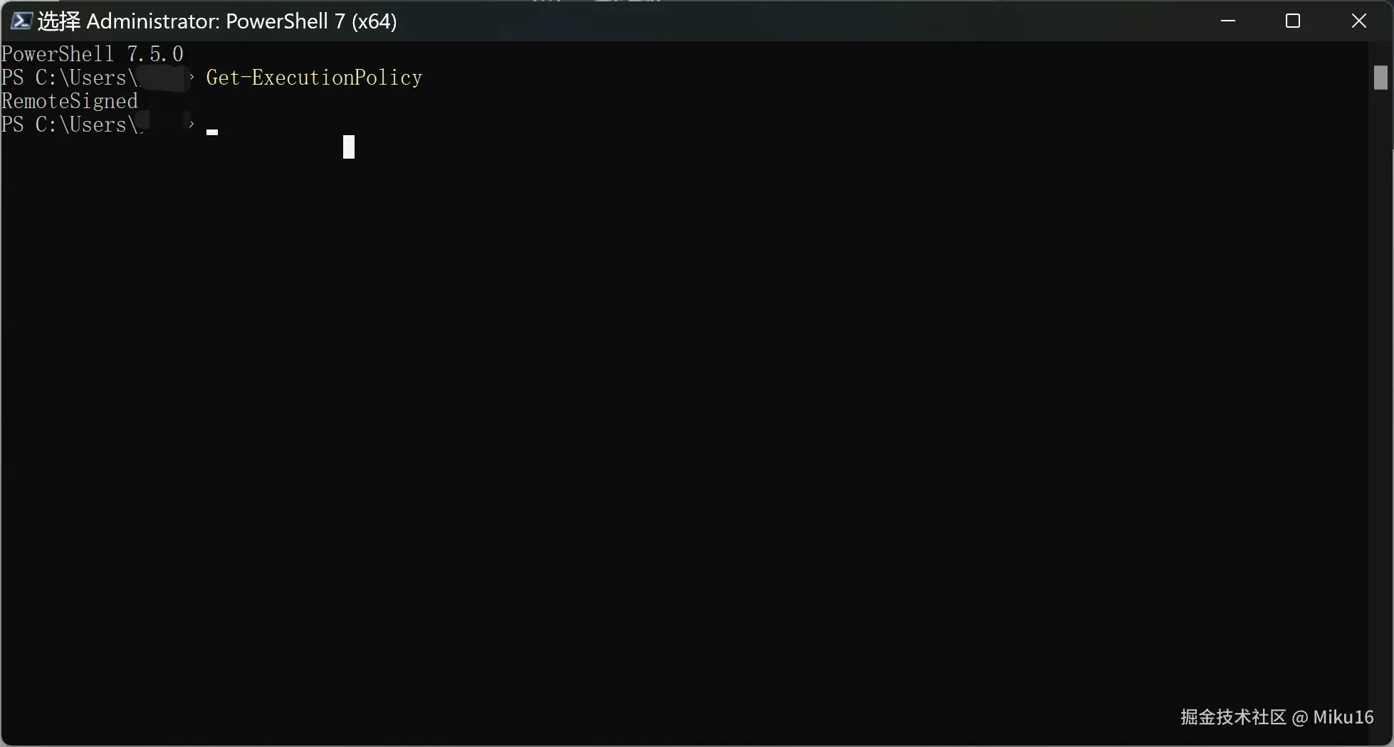 输入Get-ExecutionPolicy命令查看当前的执行策略。如果是显示Restricted,则用Set-ExecutionPolicy RemoteSigned -Scope CurrentUser命令去修改执行策略(避免脚本被阻止)。这里显示RemoteSigned,所以不需要修改。
