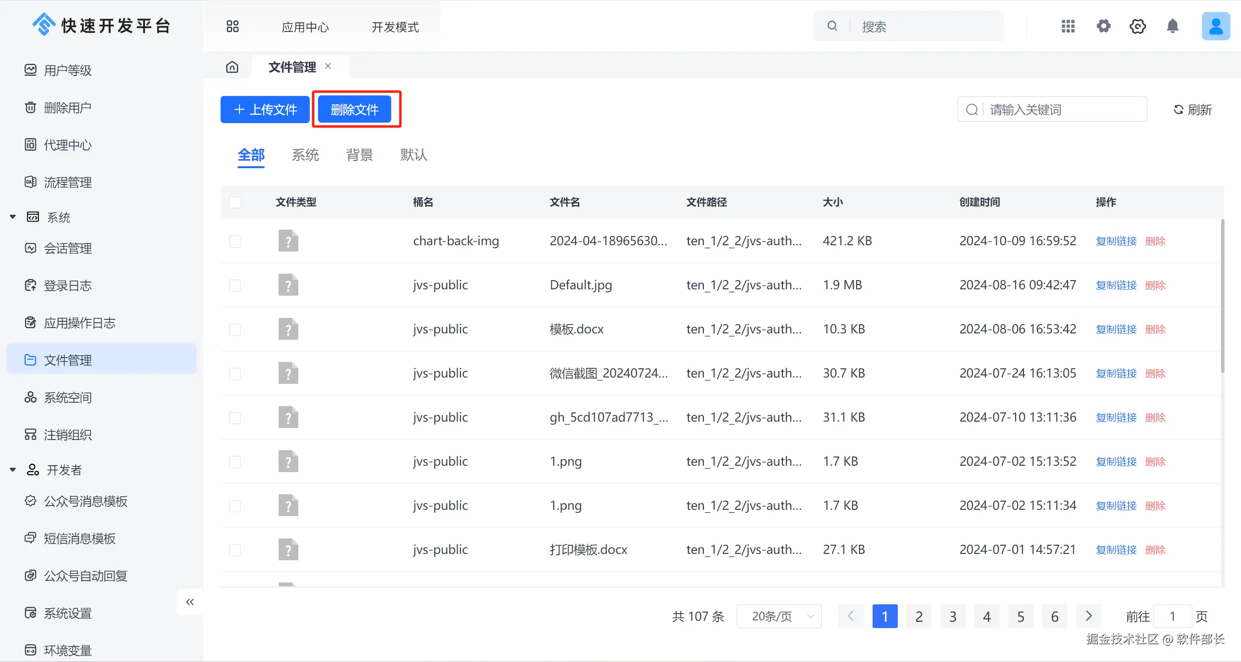 JVS开源框架中,系统提供对后台上传的相关的文件进行管理,操作如下图所示