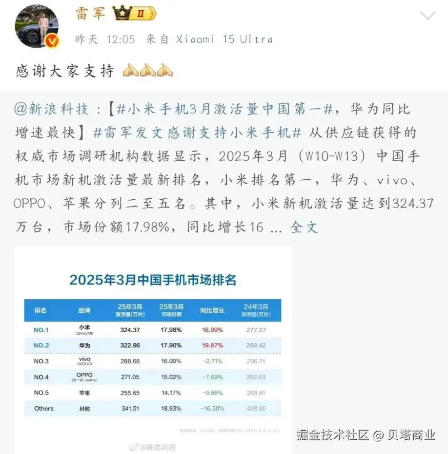 因此,当雷军4月15日因“小米手机重夺全球第一”登上热搜时,评论区更多的留言是在发出一种质问: