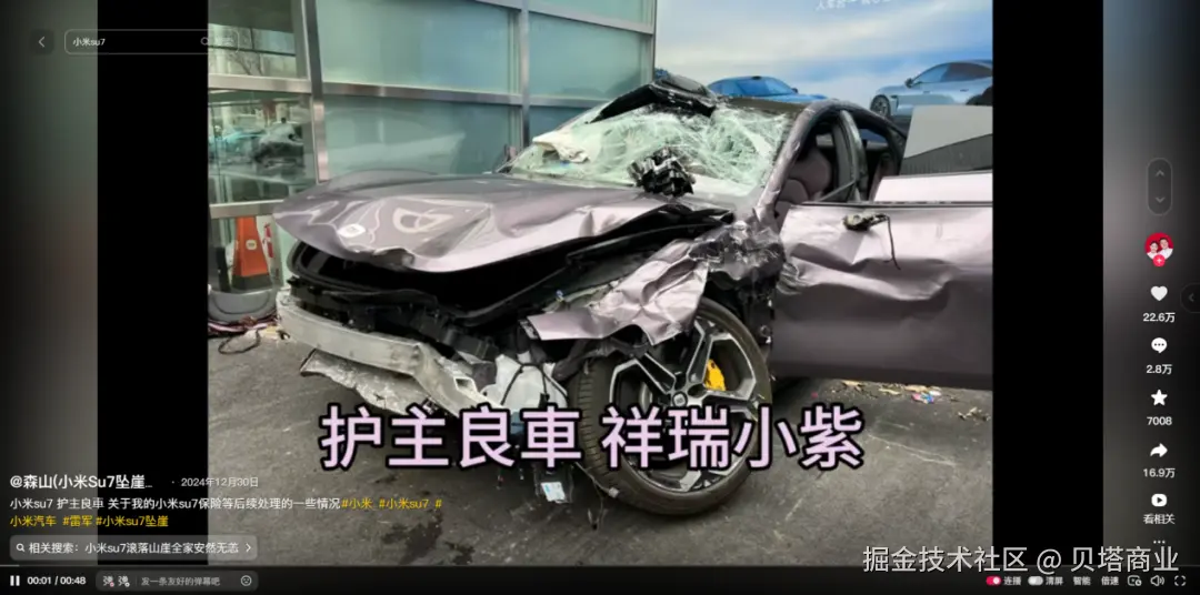 这起事故被剪辑成“小米铠甲车身”的宣传片,仅车主自己在抖音发布的视频,就收获了22.6万点赞,评论区涌入上百条“雷神护体”的评论,并有多家官方媒体转发,全网播放量以亿计数。