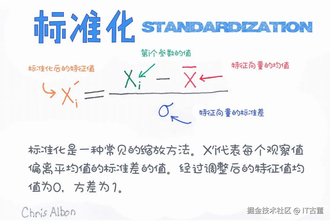 标准化,也称为 Z-score 归一化,是一种将特征值转换为标准正态分布的方法。标准化后的数据其均值为 0,标准差为 1,这意味着数据被“平移”到以 0 为中心,并根据原始分布的离散程度“压缩或拉伸”。