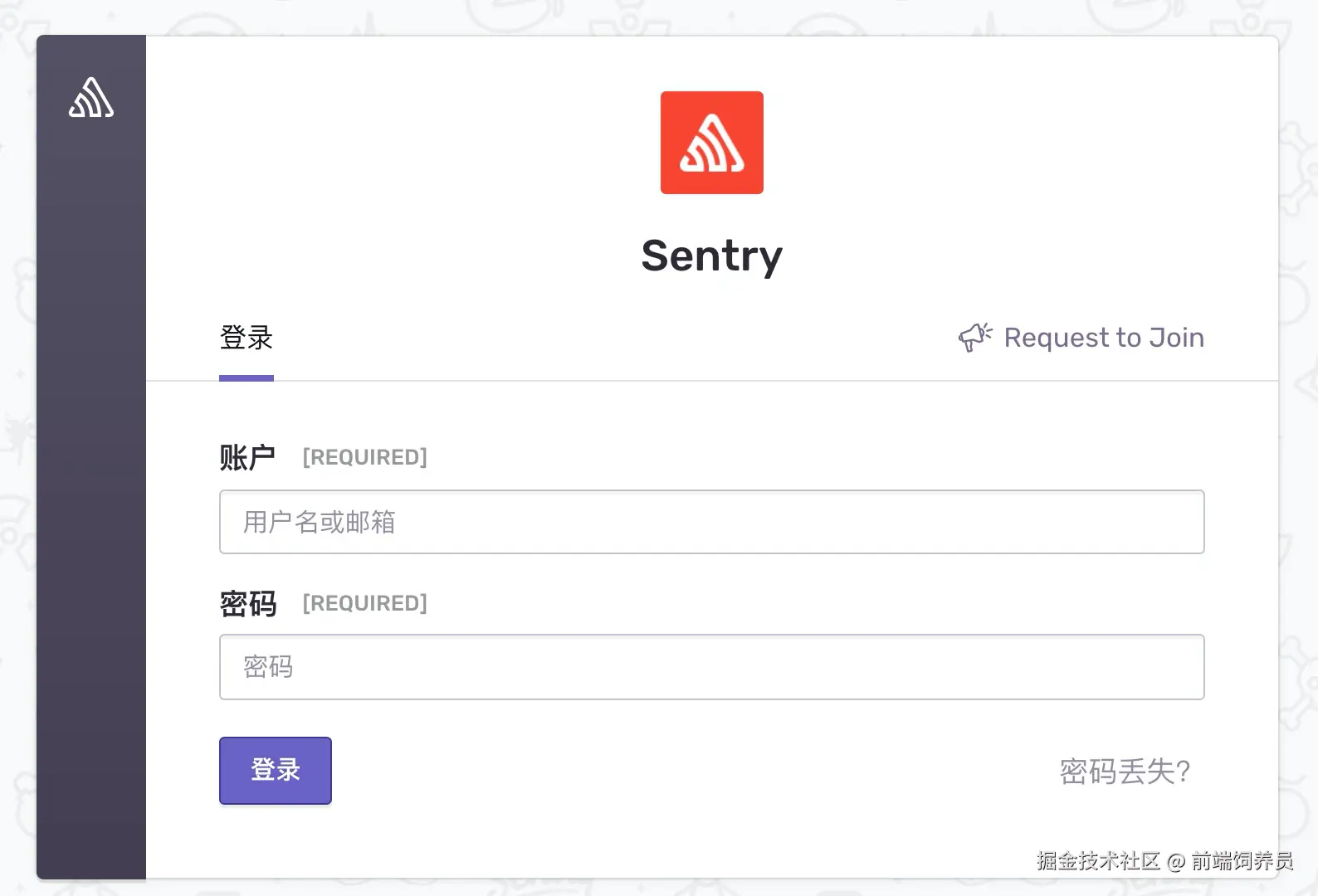 如果启动的过程一切正常,在浏览器中输入 http://ip:9000 就能访问到 Sentry 的登录页面了,然后用刚才创建的管理员用户名和密码登录系统。