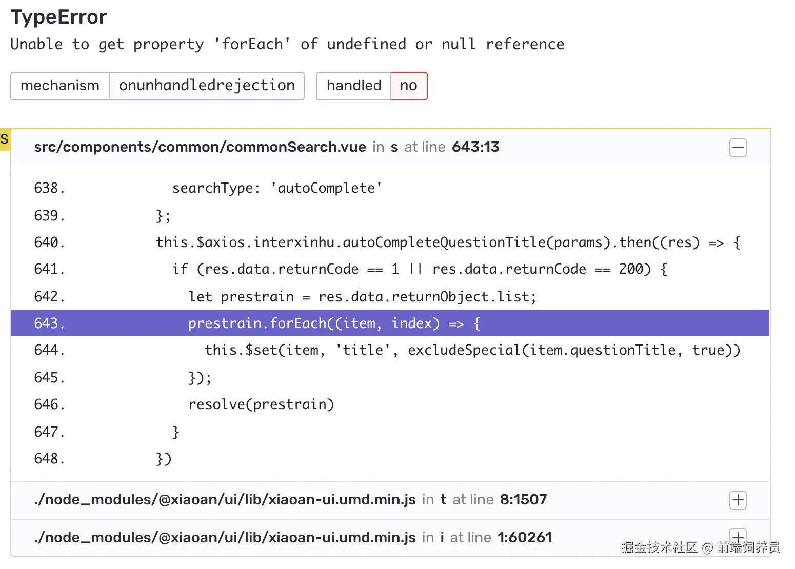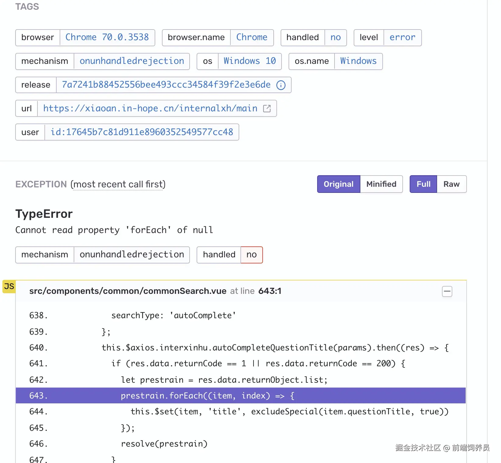 从这张图中你可以看到,Sentry 明确标识了这次报错,是在 commonSearch.vue 文件的第 643 行,同时,它把前后代码也展示出来了。